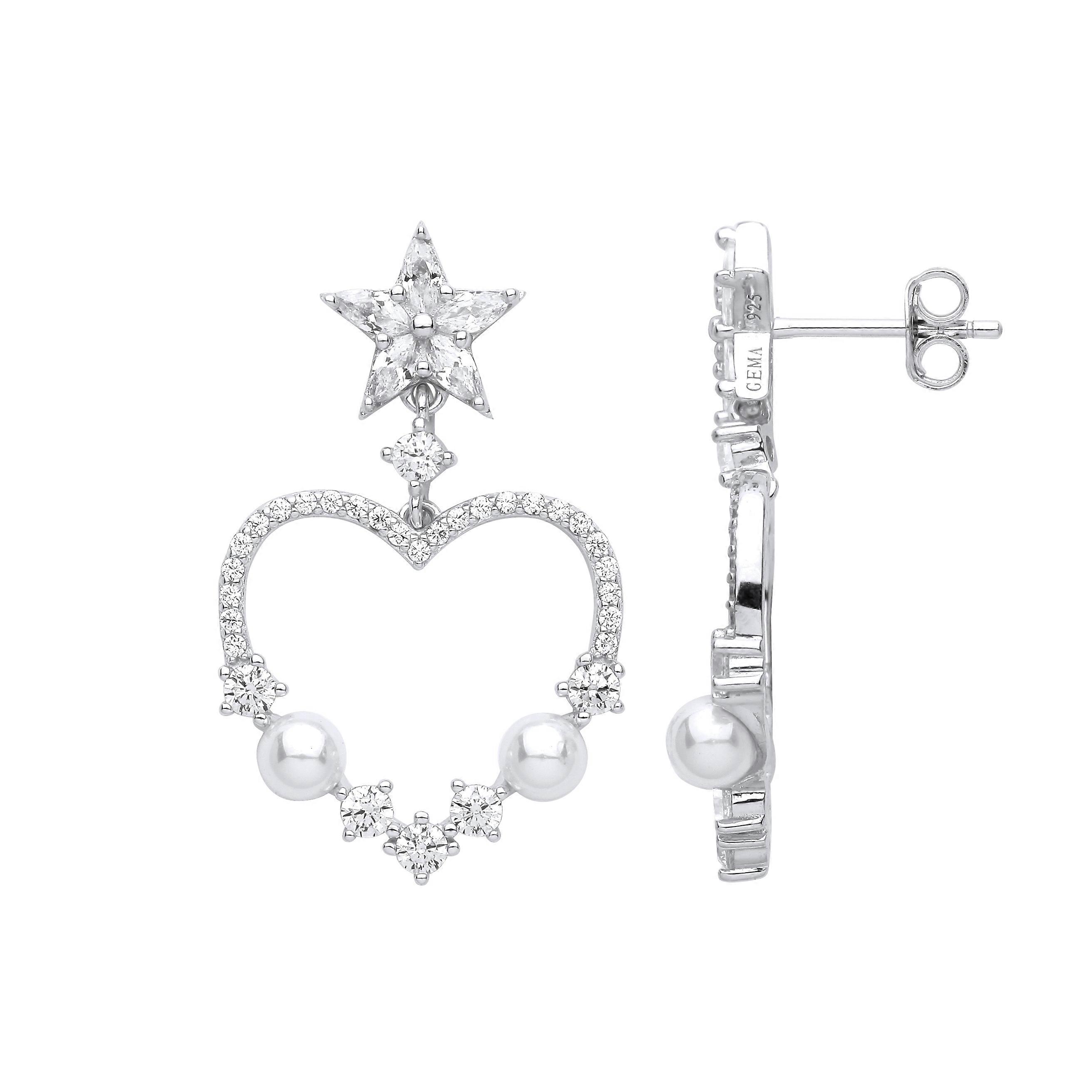 Jewelco London Ladies Rhodium Plated Sterling Silver Cream Marquise Pearl CZ Star Struck Love Heart Drop Earrings