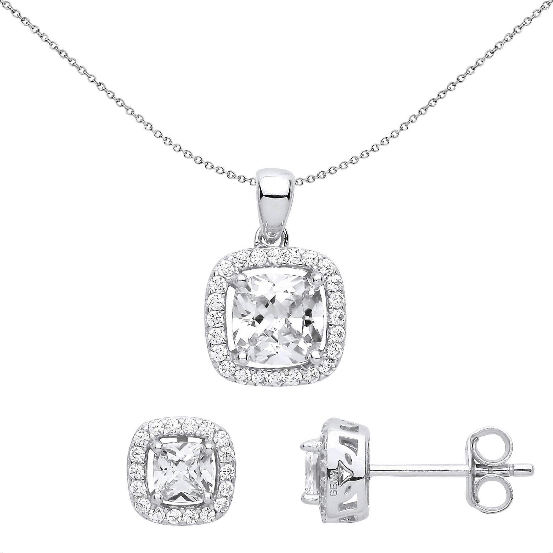 Jewelco London Ladies Rhodium Plated Sterling Silver Cushion CZ TV Square Halo Solitaire Earrings Necklace Set