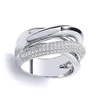 Jewelco London Ladies Rhodium Plated Sterling Silver CZ 3 Way Pave Crossover Russian Cocktail Ring