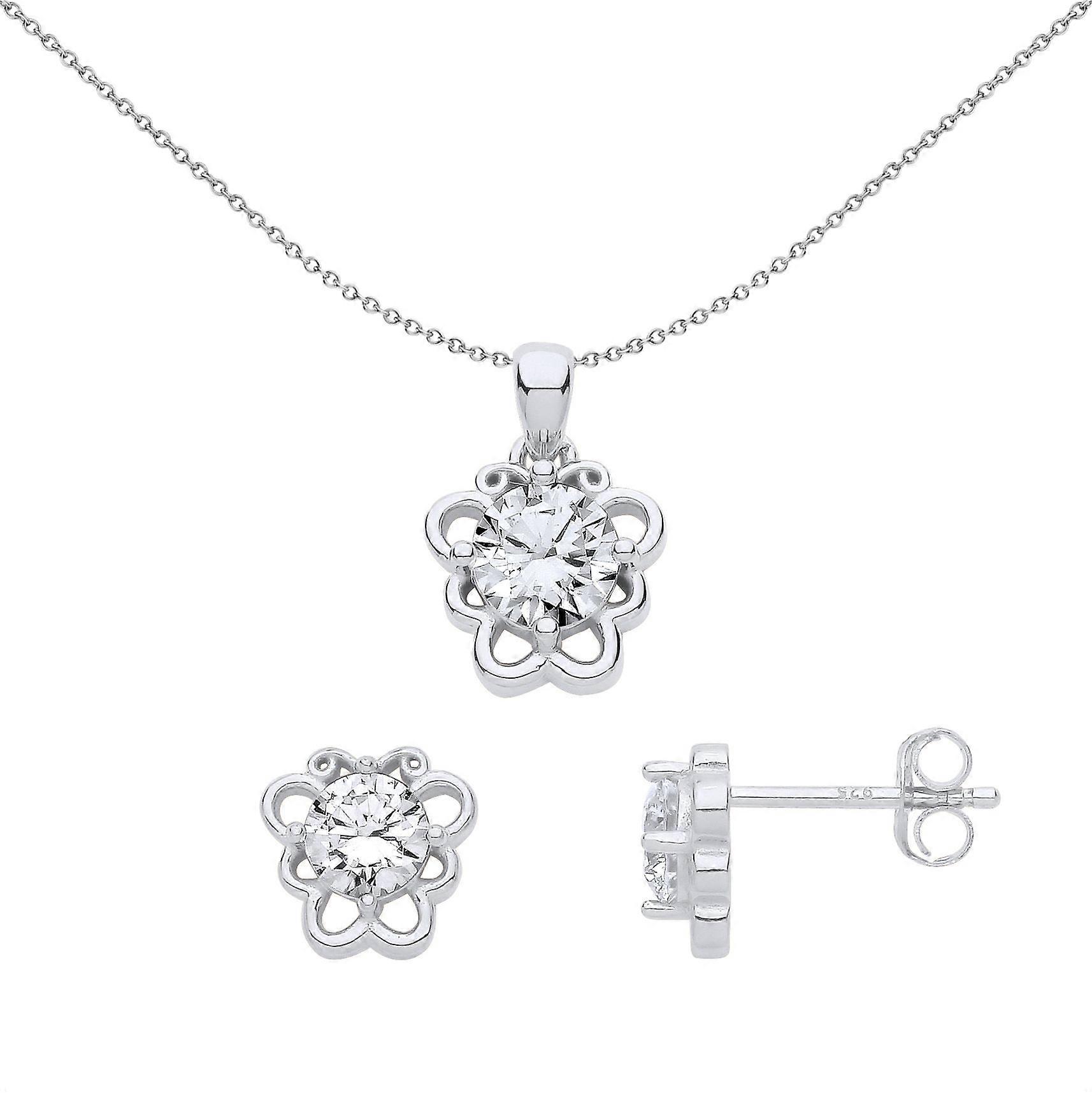 Jewelco London Ladies Rhodium Plated Sterling Silver CZ Butterfly Scrolls Solitaire Earrings Necklace Set