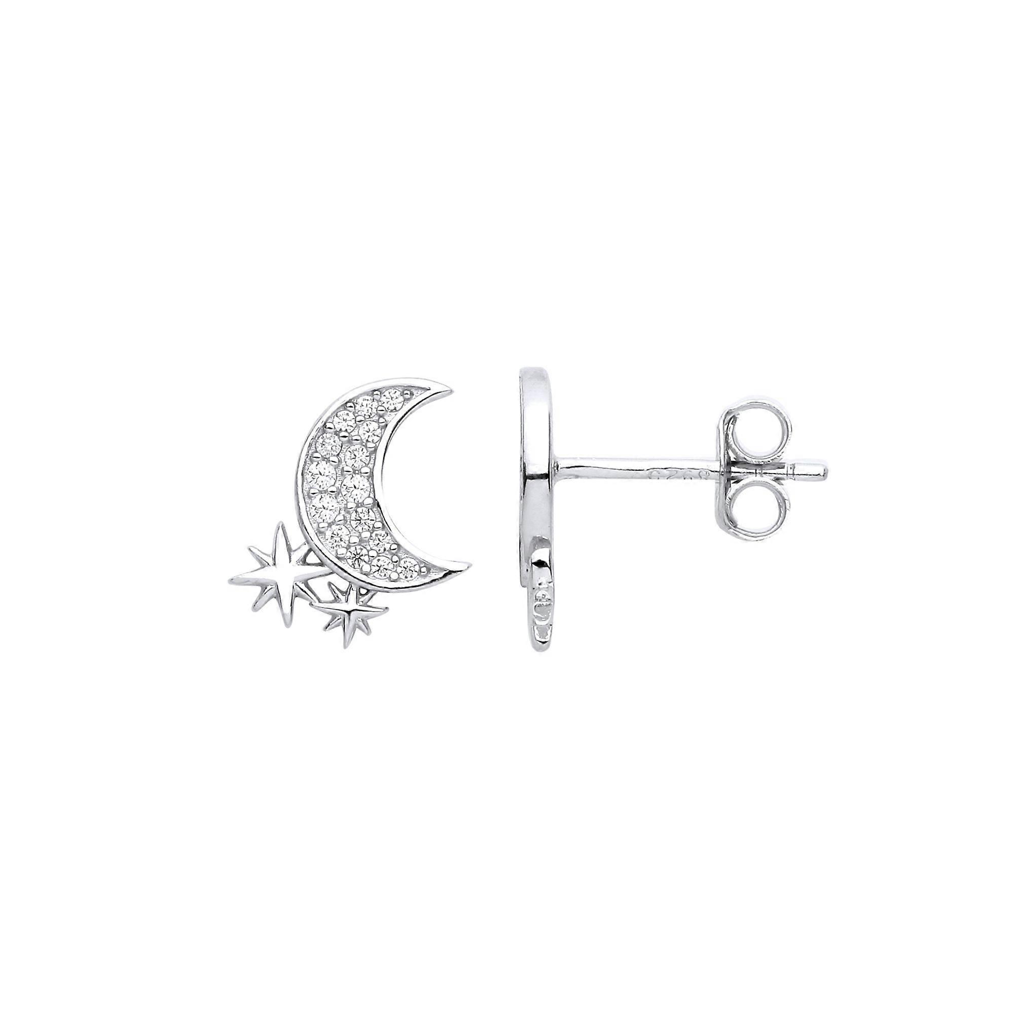 Jewelco London Ladies Rhodium Plated Sterling Silver CZ Crescent Moon Sparkly Stars Stud Earrings