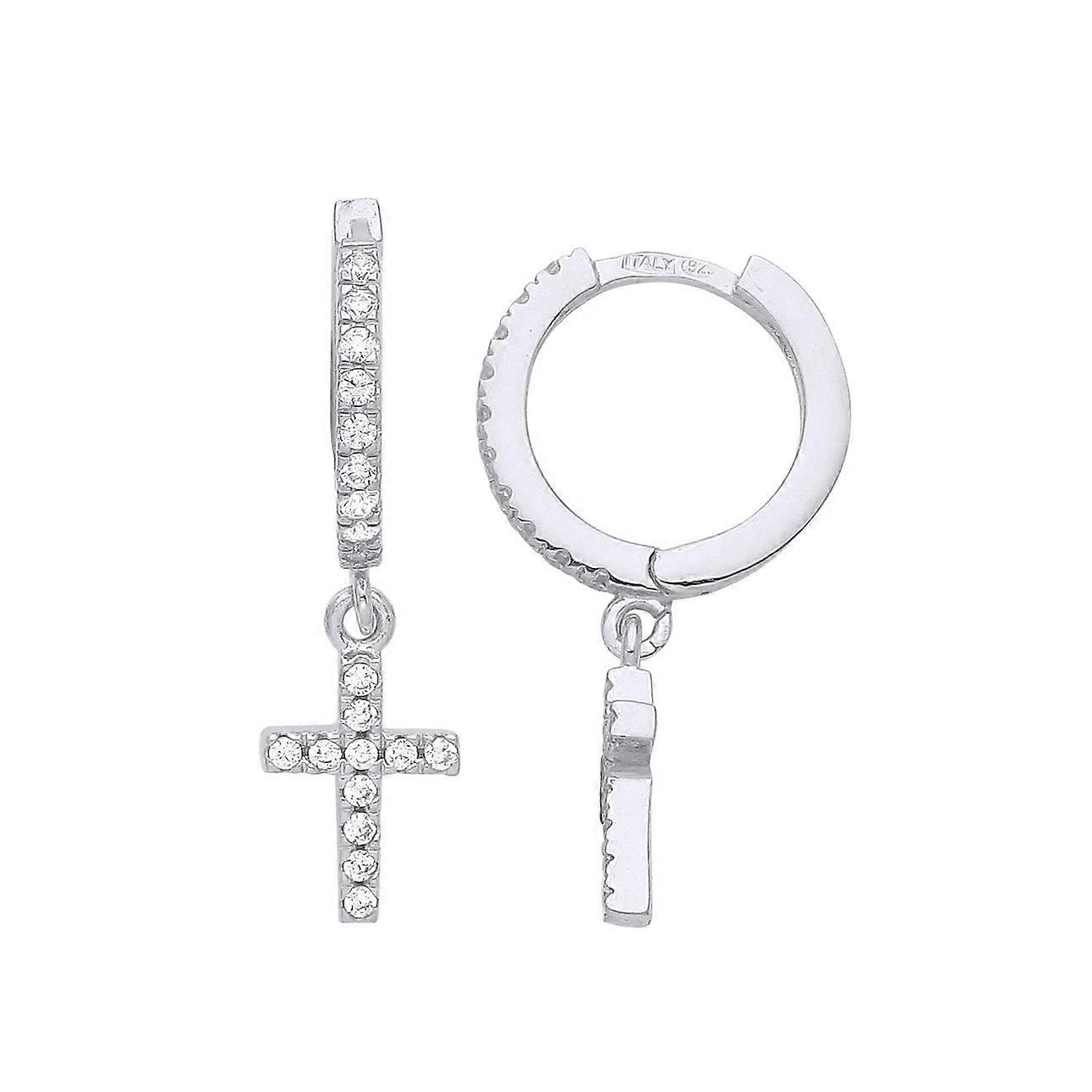 Jewelco London Ladies Rhodium Plated Sterling Silver CZ Eternity Huggie Hoop Cross Drop Earrings