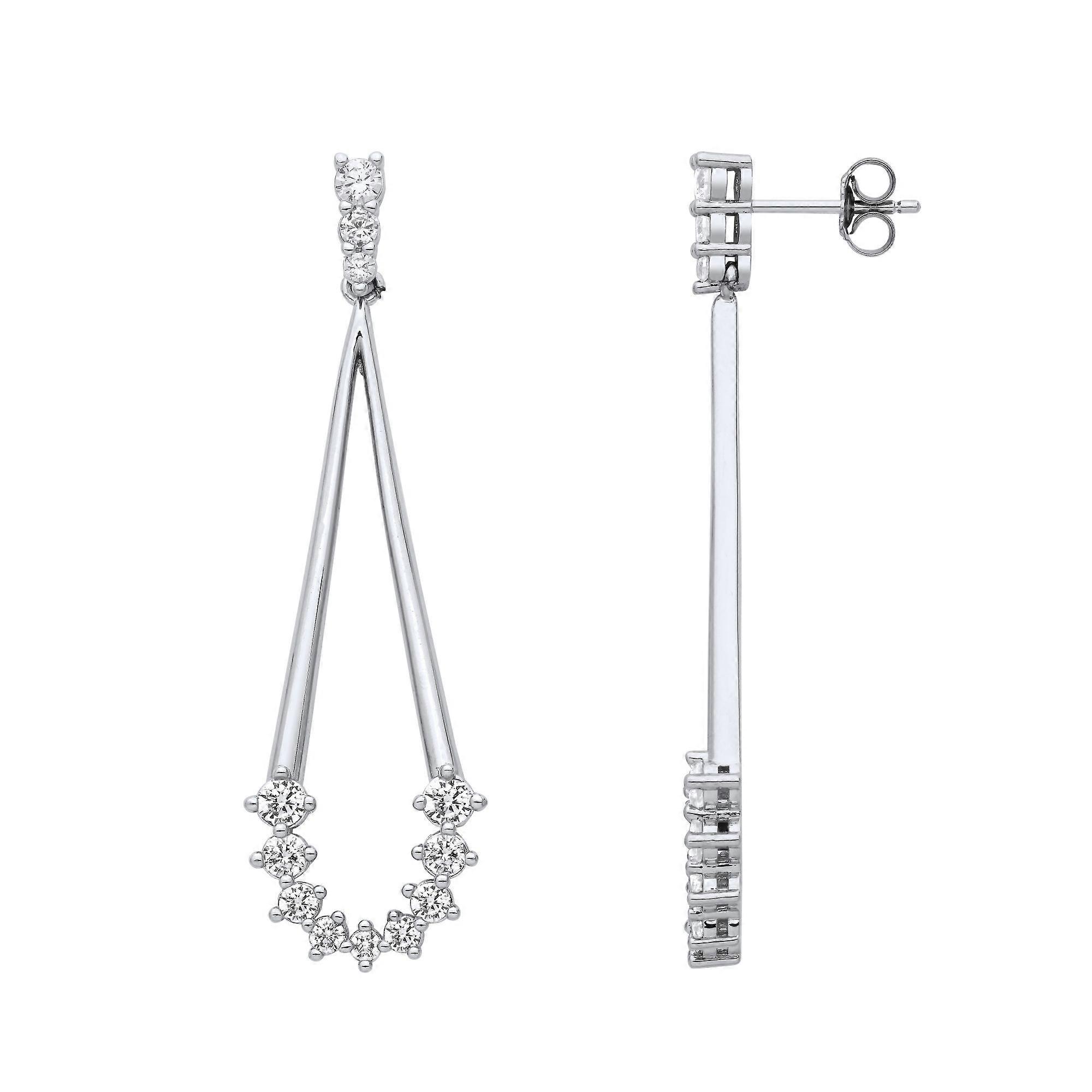 Jewelco London presents this piece from its latest collection of jewellery, a pair of ladies drop earrings made of rhodium plated sterling silver in a flaming comet chandelier design, set with white round cubic zirconia gemstones. Fitted with post and butterfly fittings for security Approx dimensions: Height: 52mm Width: 15.8mm Weight: 6.9g GEMSTONE: Cubic Zirconia, Round, White, Simulated SKU: EAG1204