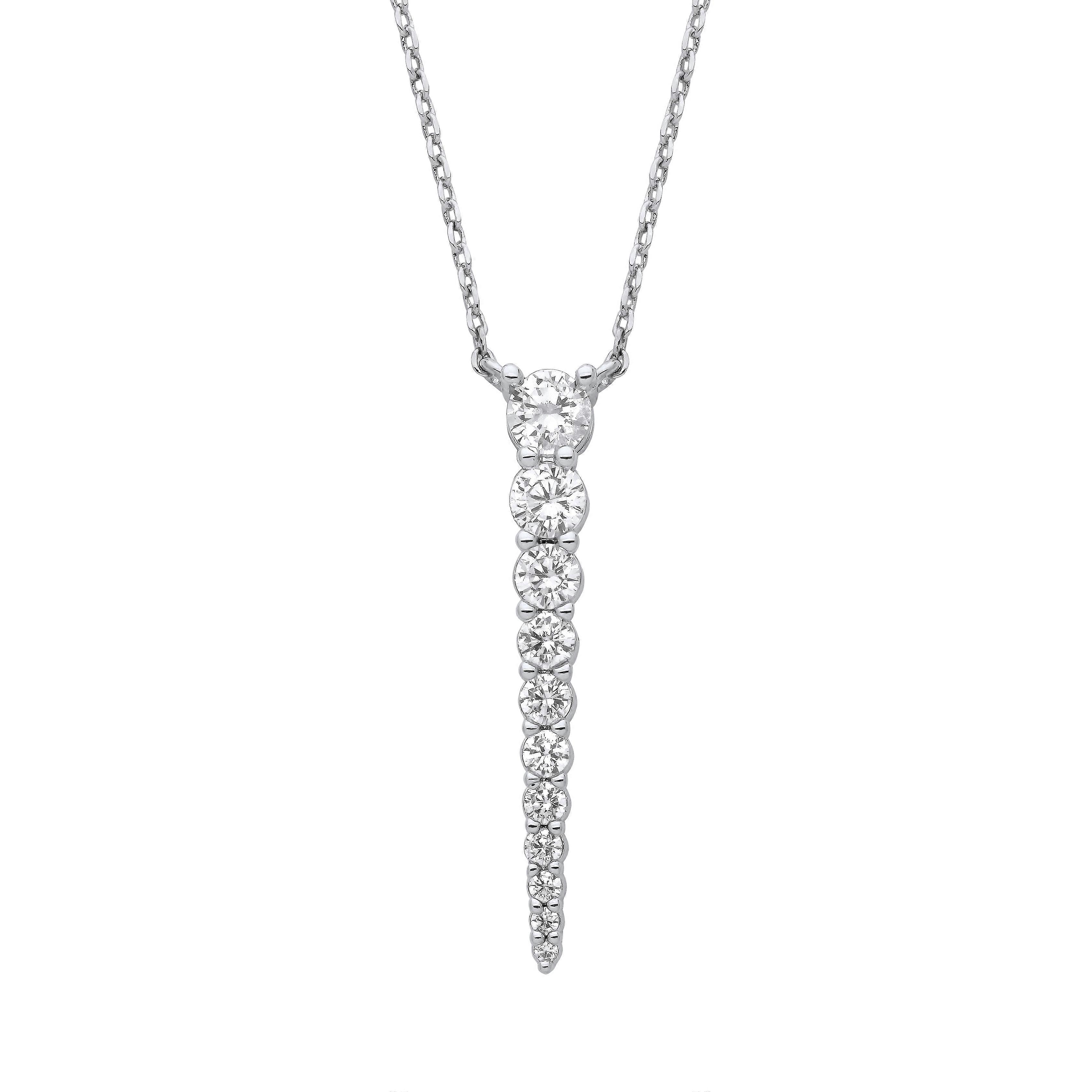 Jewelco London presents this piece from its latest collection of jewellery, a ladies lavalier necklace made of rhodium plated sterling silver in a graduated 10 stone icicle design, set with white round cubic zirconia gemstones. Approx dimensions: 16 + 2 inch | Height: 32mm Width: 5.1mm Weight: 3.4g GEMSTONE: Cubic Zirconia, Round, White SKU: GVK464