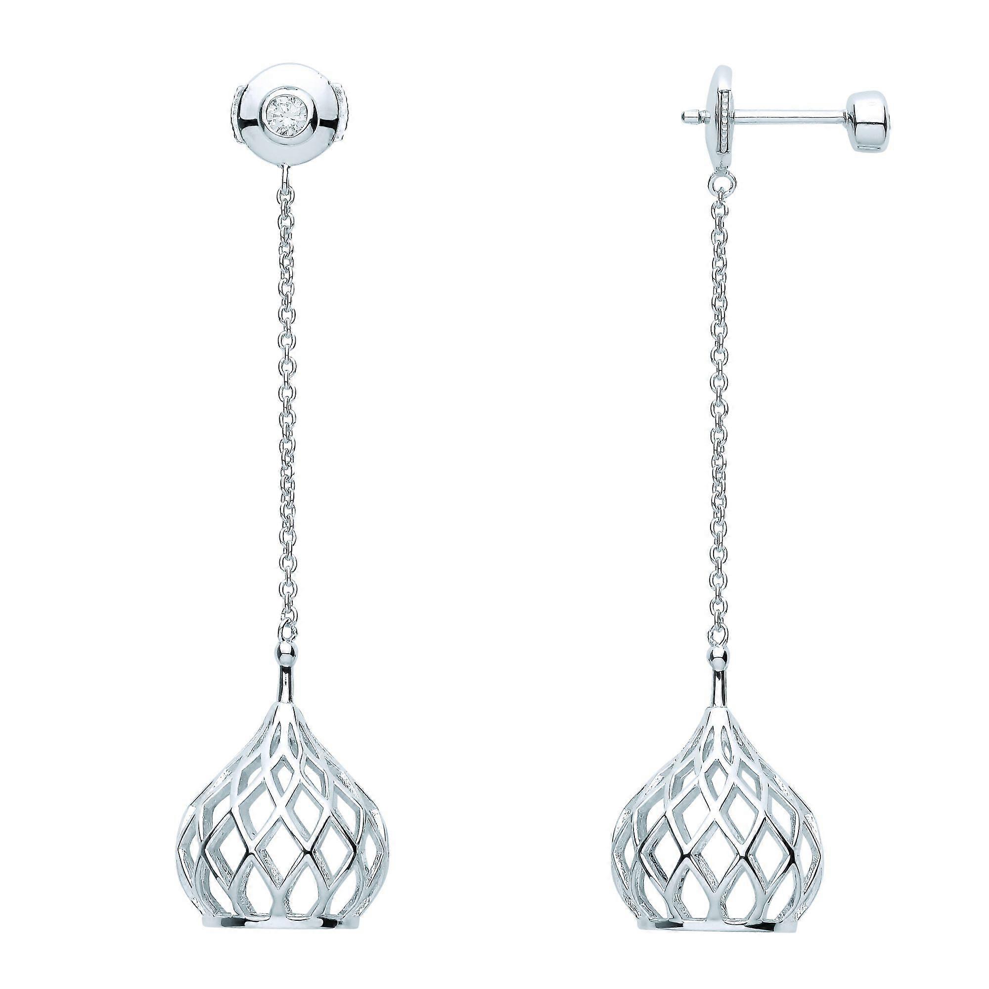 Jewelco London presents this piece from its latest collection of jewellery, a pair of ladies drop earrings made of rhodium plated sterling silver in a hanging basket lantern shoulder duster design, set with white round cubic zirconia gemstones. Approx dimensions: Height: 58mm Width: 14mm Weight: 5g GEMSTONE: Cubic Zirconia, Round, White, Simulated SKU: EAG1093