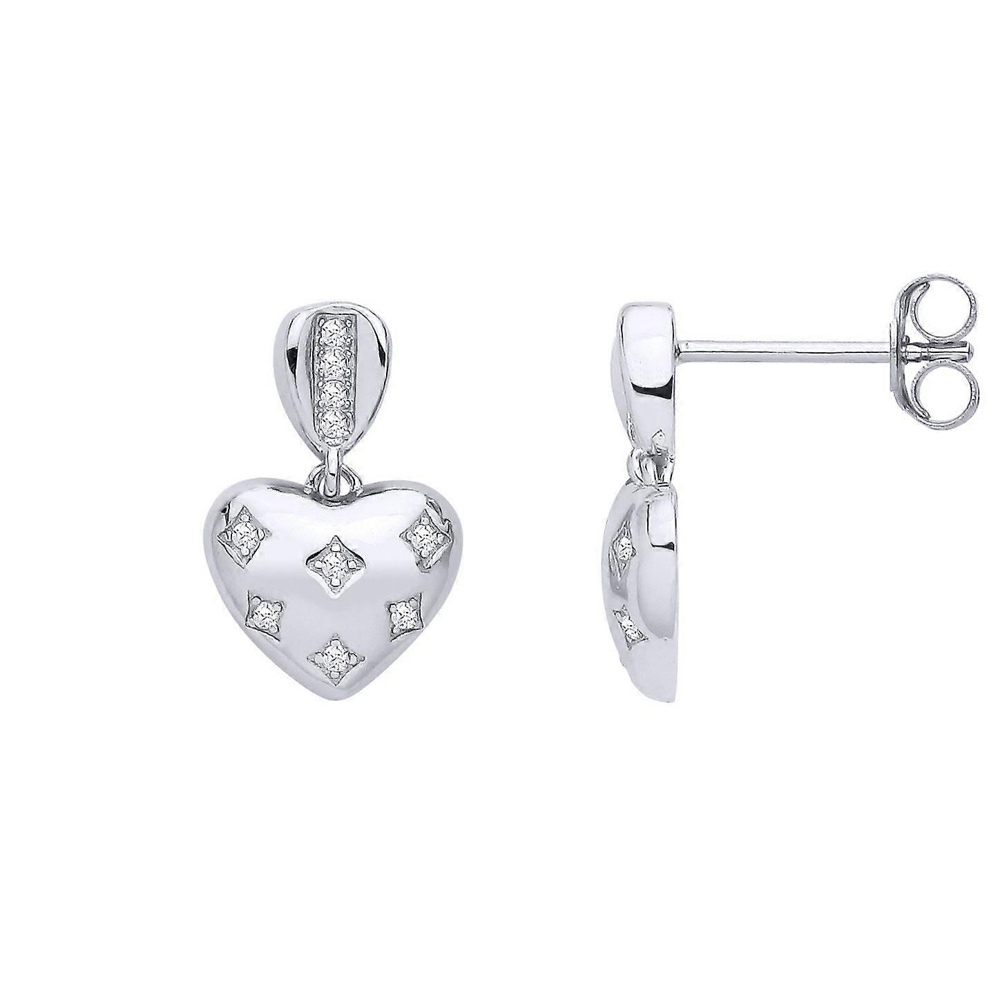 Jewelco London Ladies Rhodium Plated Sterling Silver CZ Love Heart Pillow Drop Earrings