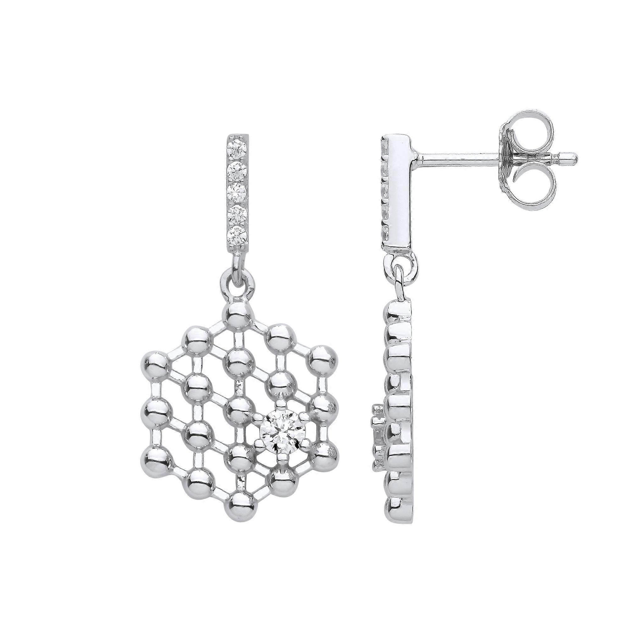 Jewelco London Ladies Rhodium Plated Sterling Silver CZ Molecular Model Structure Hexagon Honeycomb Drop Earrings