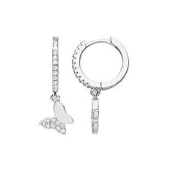 Jewelco London Ladies Rhodium Plated Sterling Silver CZ Semi Set Butterfly Charm Huggie Hoop Drop Earrings