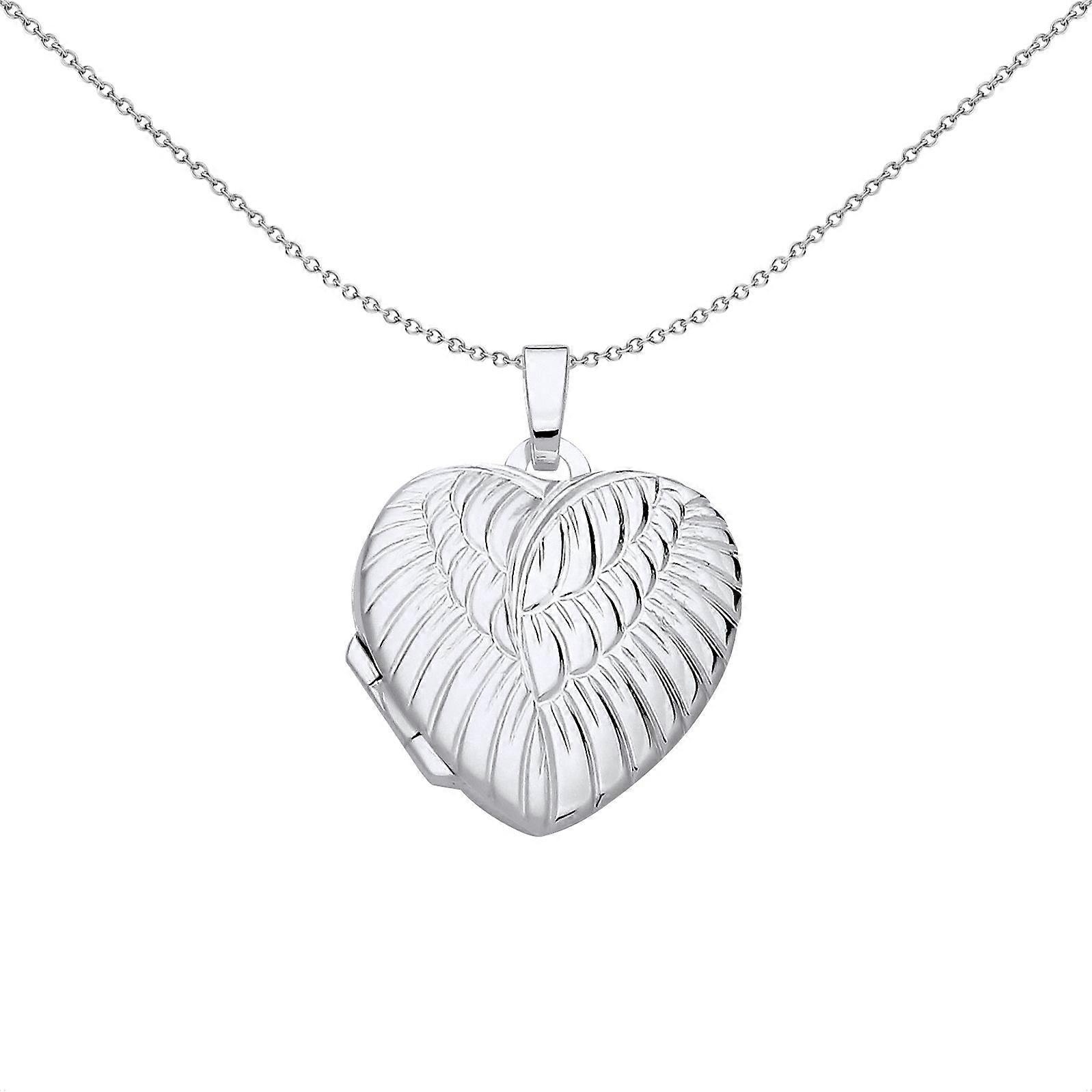 Jewelco London Ladies Rhodium Plated Sterling Silver Engraved Angel Wings Love Heart Locket Pendant Necklace