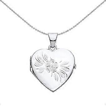 Jewelco London Ladies Rhodium Plated Sterling Silver Flower Leaves Engraved Love Heart Locket Pendant Necklace
