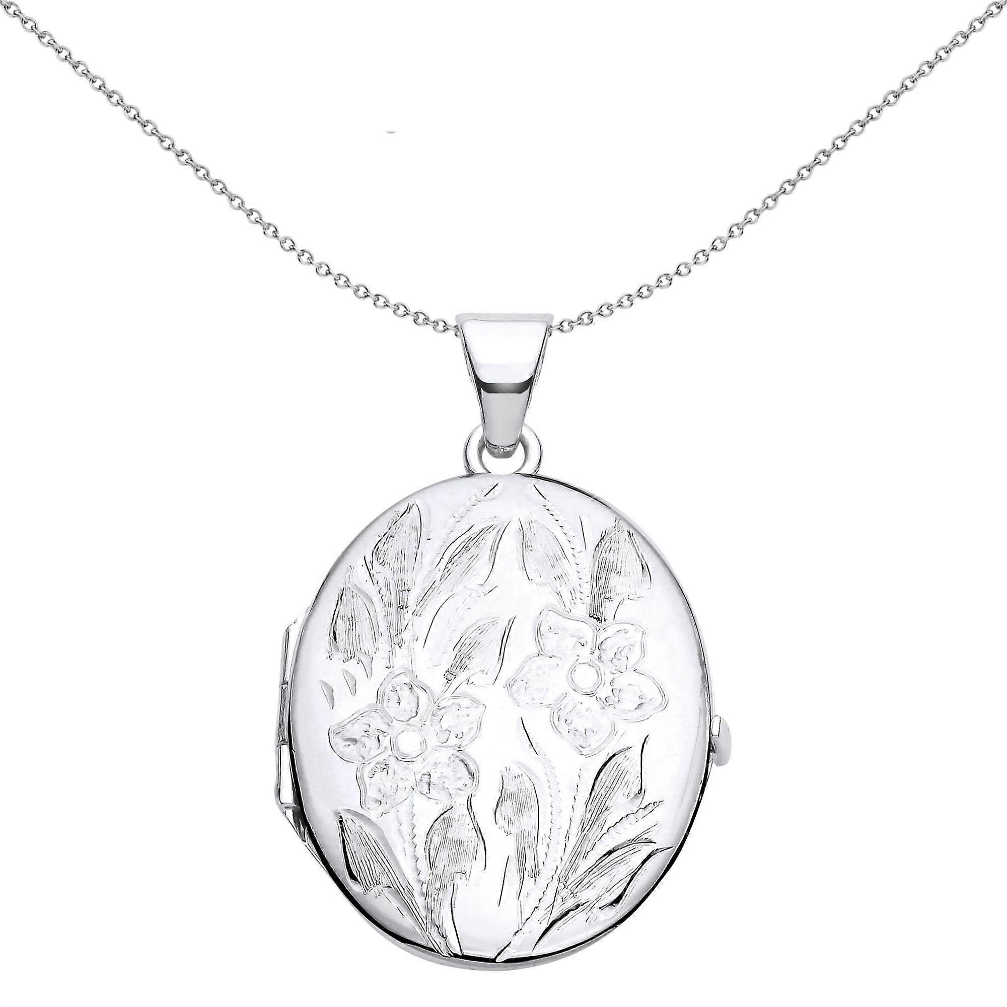 Jewelco London Ladies Rhodium Plated Sterling Silver Flower Leaves Engraved Oval Locket Pendant Necklace