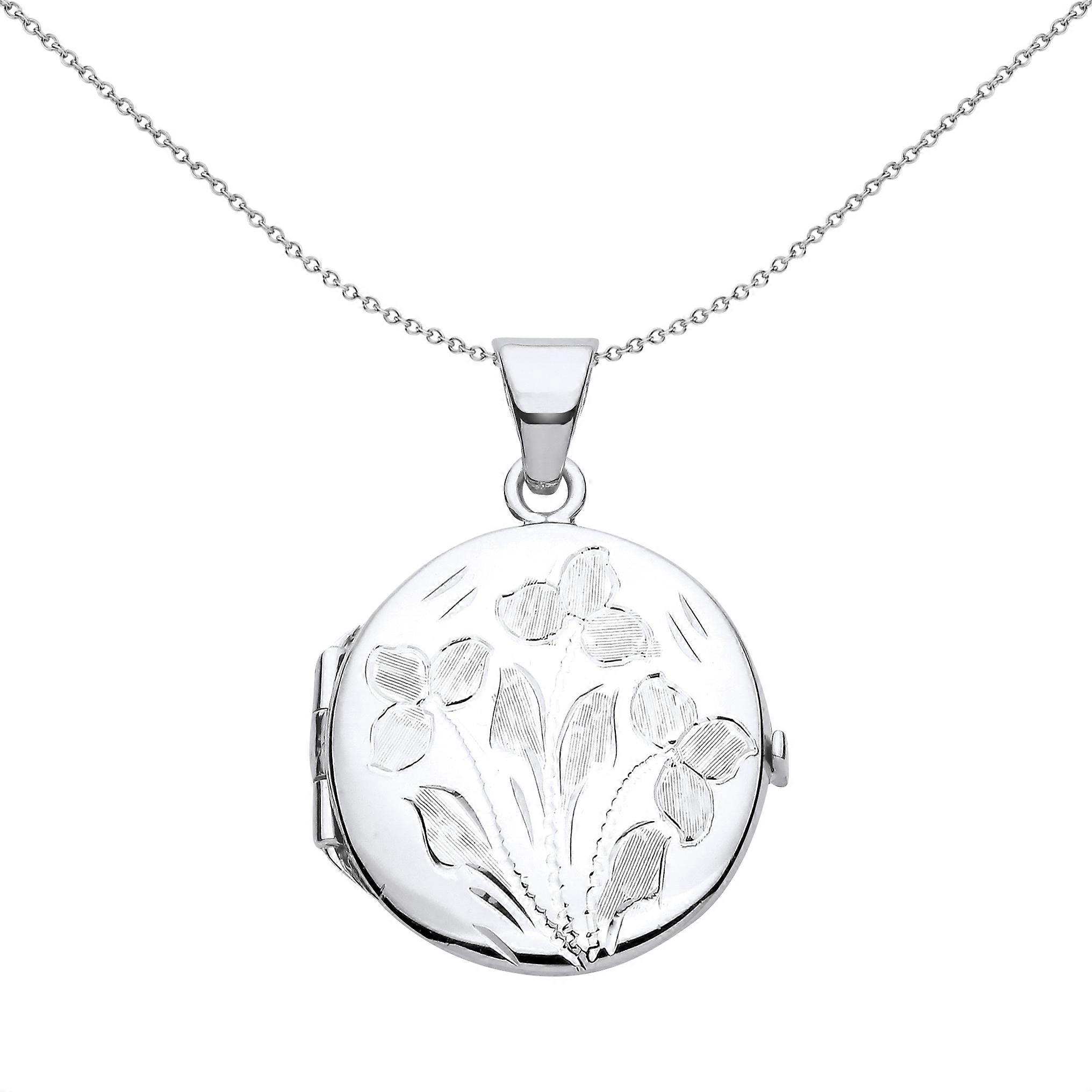 Jewelco London Ladies Rhodium Plated Sterling Silver Flower Leaves Engraved Round Locket Pendant Necklace 18 inch