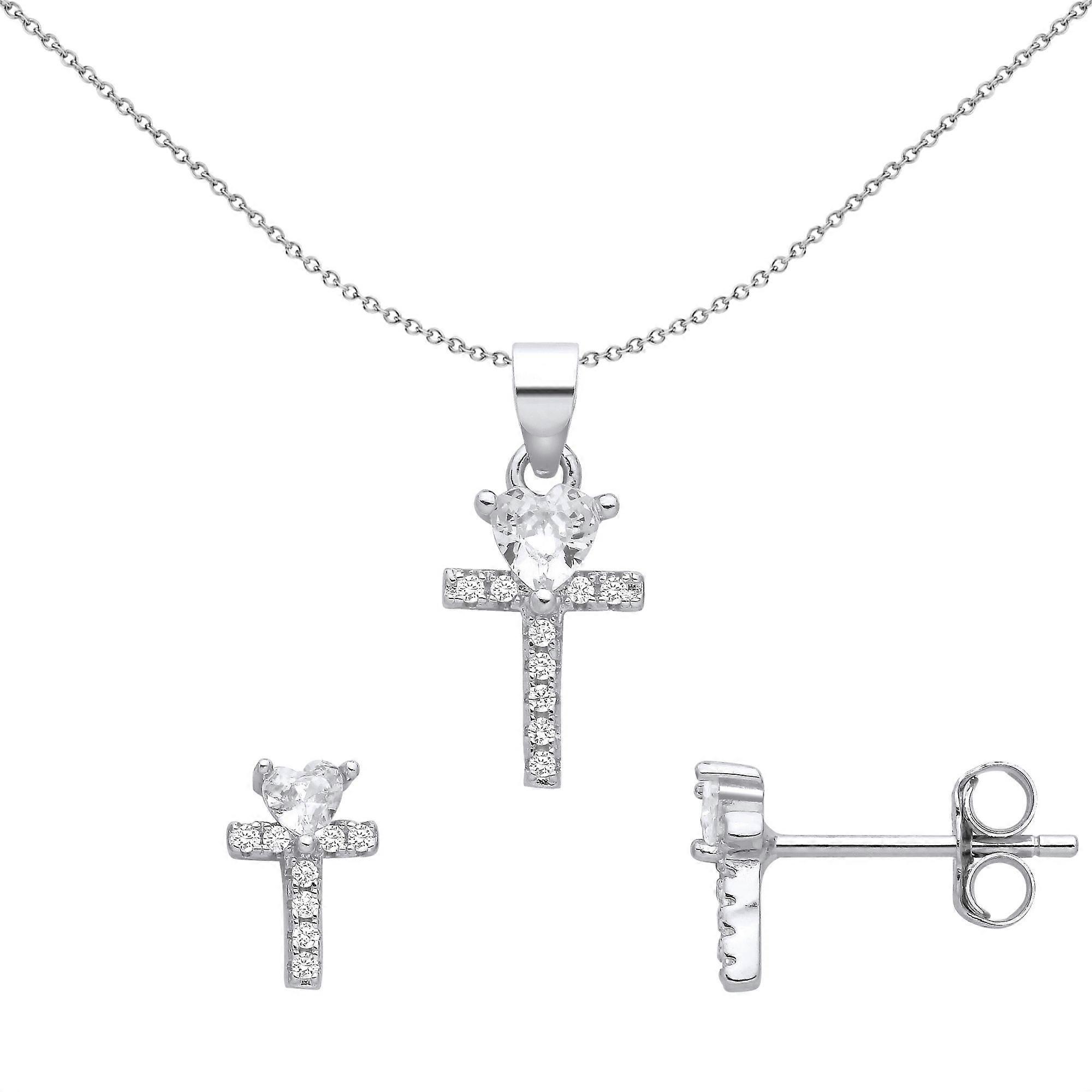 Jewelco London Ladies Rhodium Plated Sterling Silver Heart CZ Love Heart T Cross Earrings Necklace Set