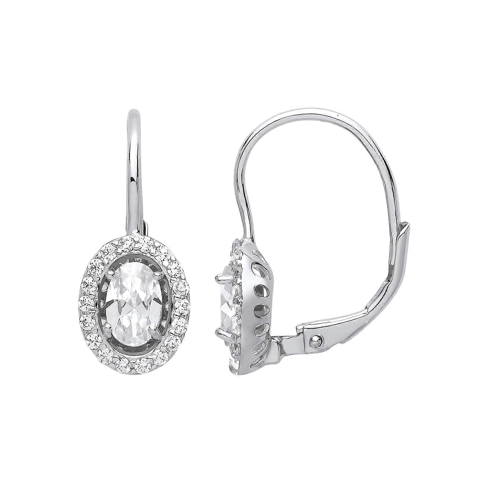 Jewelco London presents this piece from its latest collection of jewellery, a pair of ladies drop earrings made of rhodium plated sterling silver in a solitaire halo design, set with white oval cubic zirconia & white round cubic zirconia gemstones. Fitted with lever backs to ensure the earrings stay in place.Approx dimensions: Height: 18mm Width: 8mm Gauge: 14mm GEMSTONE: Cubic Zirconia, Oval, White GEMSTONE 2: Cubic Zirconia, Round, White SKU: GVE815WH