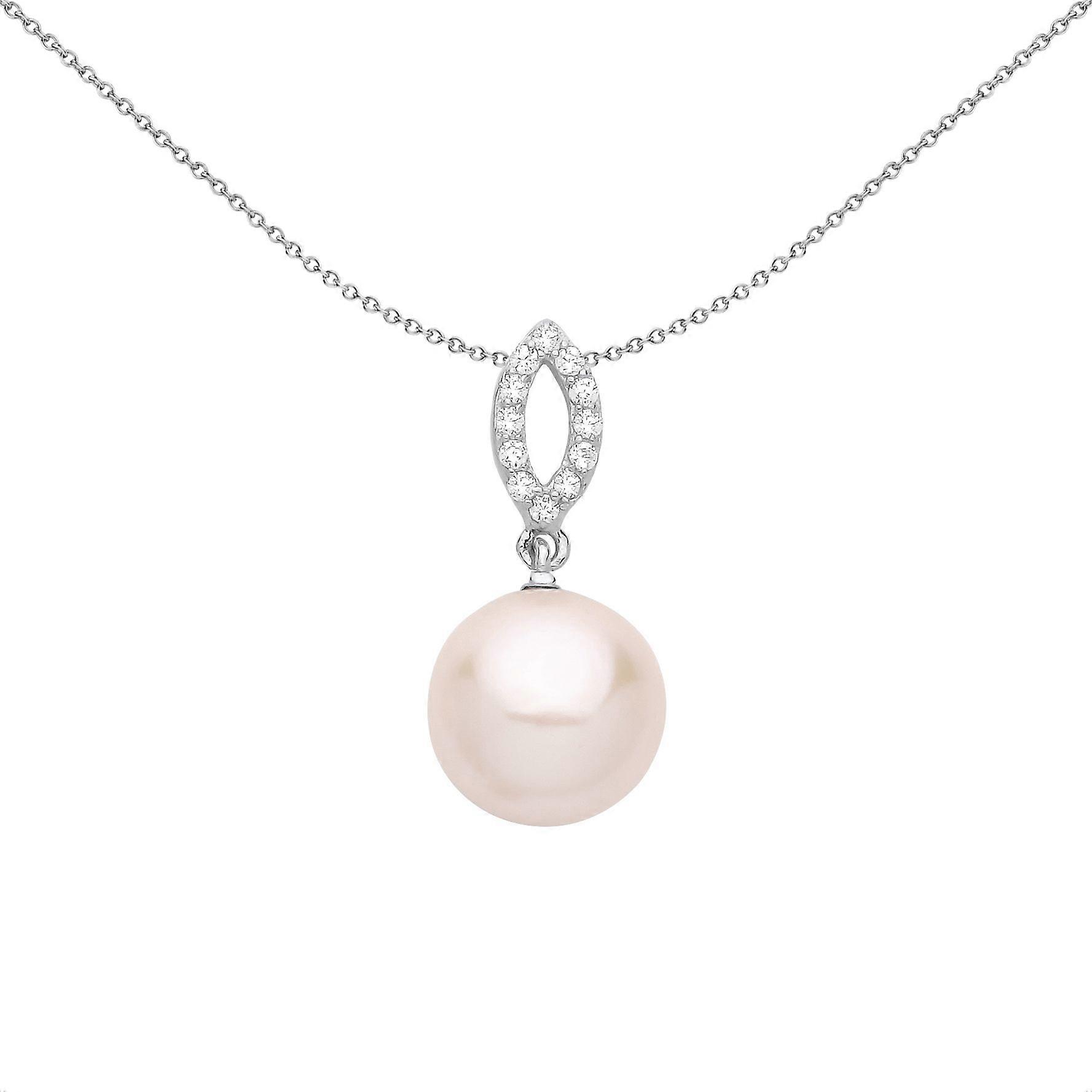 Jewelco London Ladies Rhodium Plated Sterling Silver Peach Pearl CZ Cats Eyes Halo Full Moon Pendant Necklace 18 inch