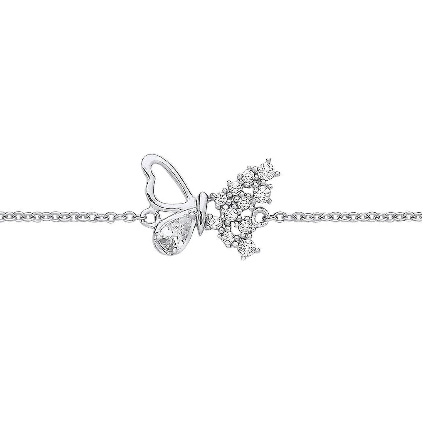 Jewelco London Ladies Rhodium Plated Sterling Silver Pear CZ Frosted Butterfly Rolo Charm Bracelet 7.25 + 1 inch