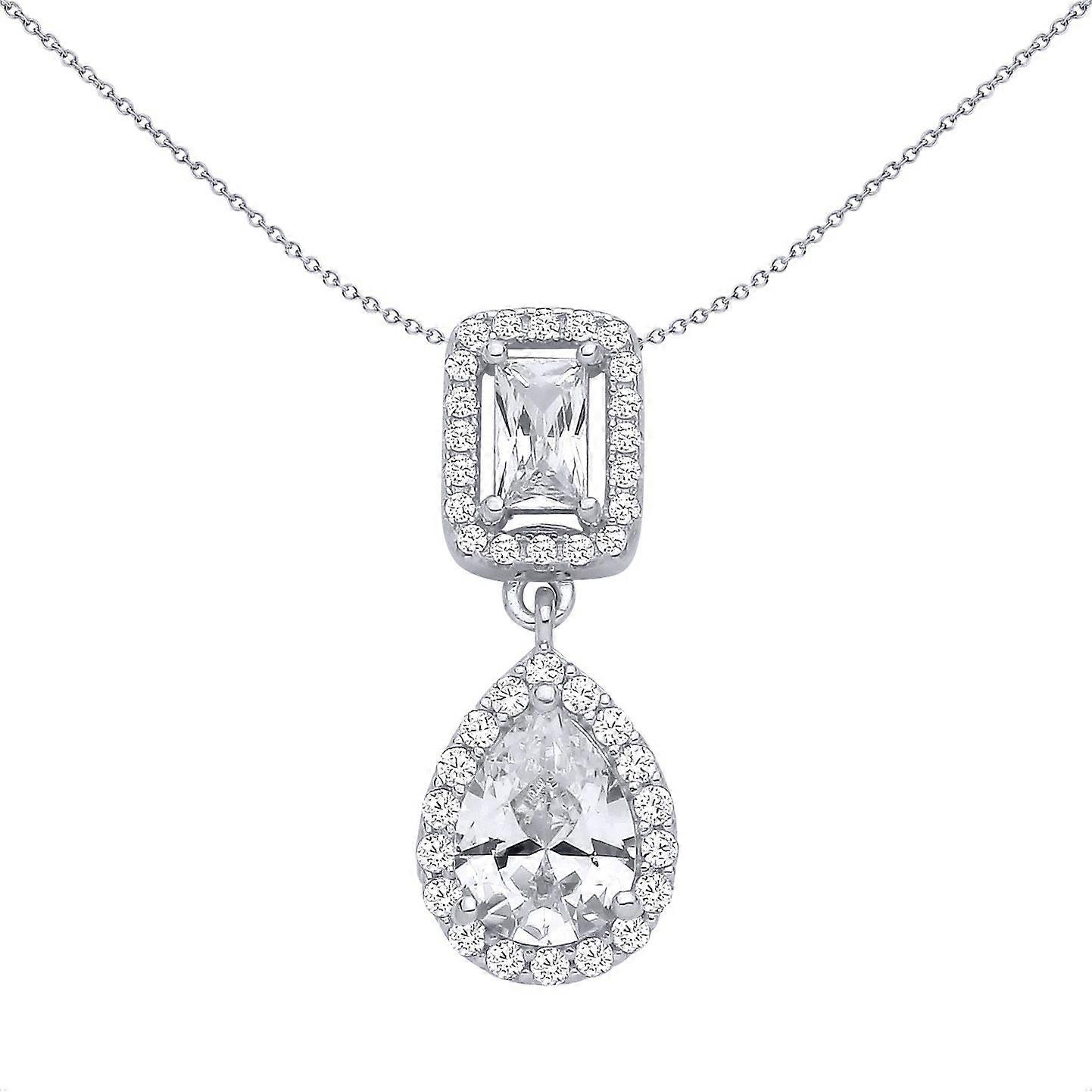Jewelco London Ladies Rhodium Plated Sterling Silver Pear Radiant CZ Toi et Moi Halo Pendant Necklace