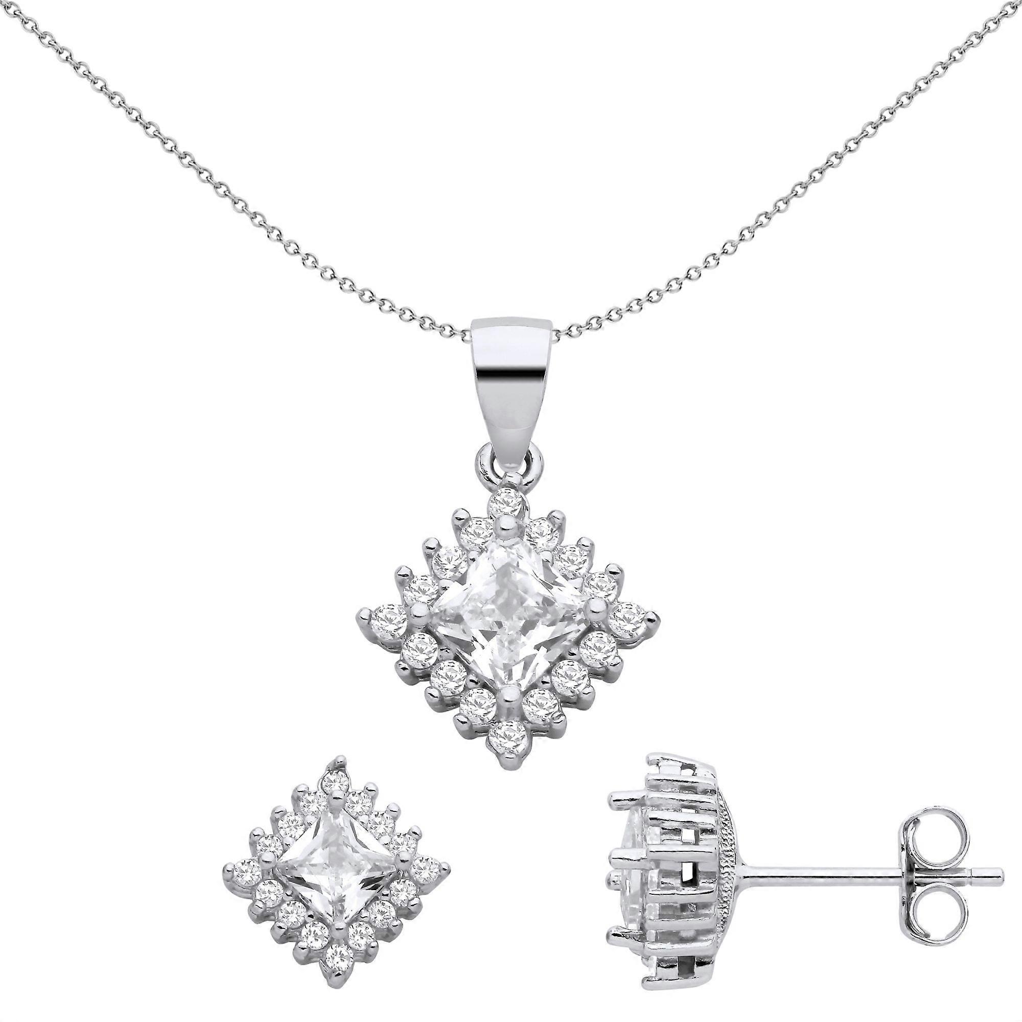 Jewelco London Ladies Rhodium Plated Sterling Silver Princess CZ Rotated Square Halo Cluster Earrings Necklace Set