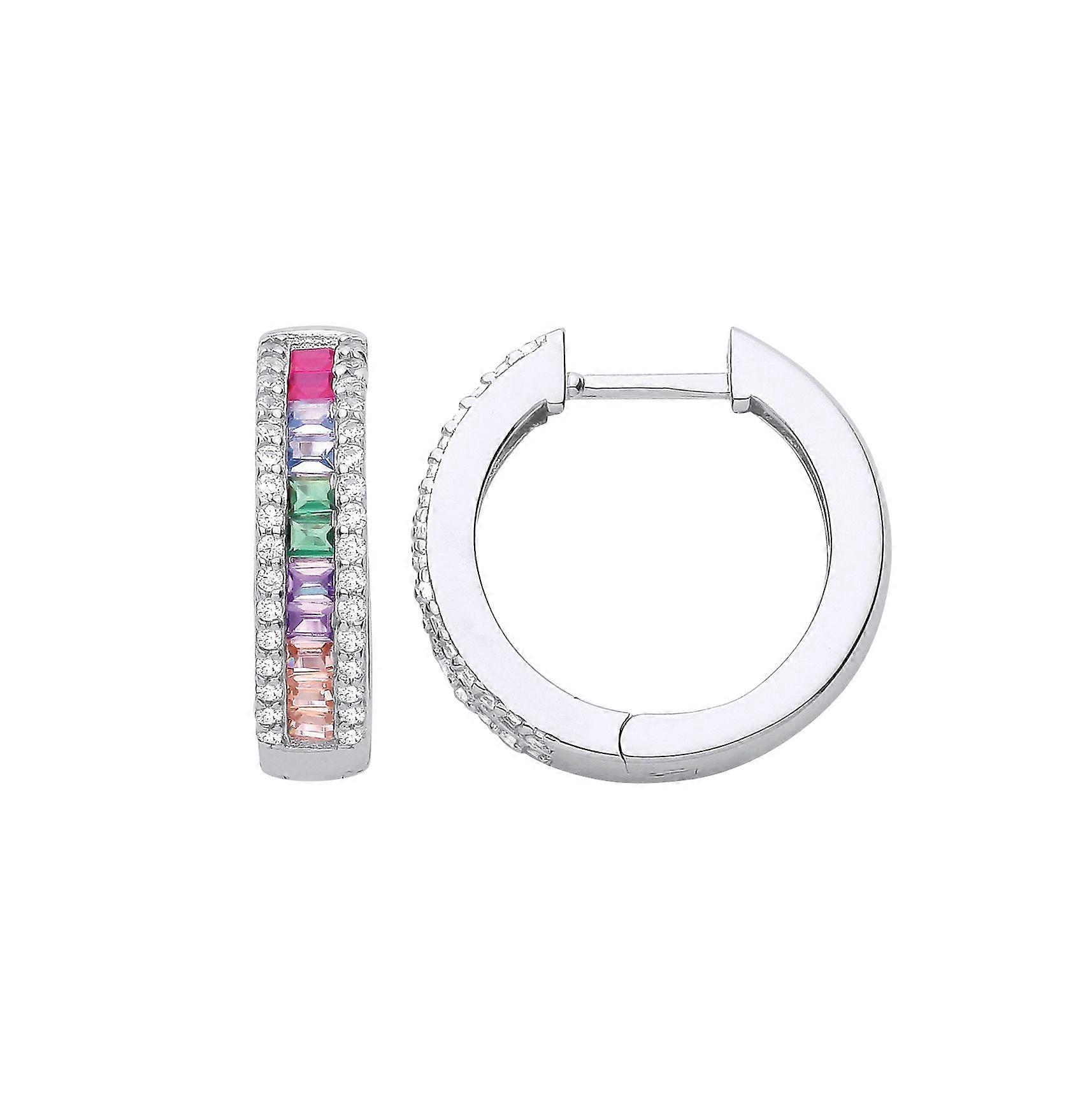Jewelco London Ladies Rhodium Plated Sterling Silver Rainbow Baguette CZ 3/4 Circle of Life Coral Rainbow Drop Earrings