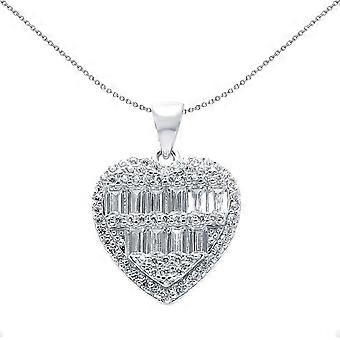 Jewelco London Ladies Rhodium Plated Sterling Silver Round & Baguette Cubic Zirconia Halo Shimmering Love Heart Pendant