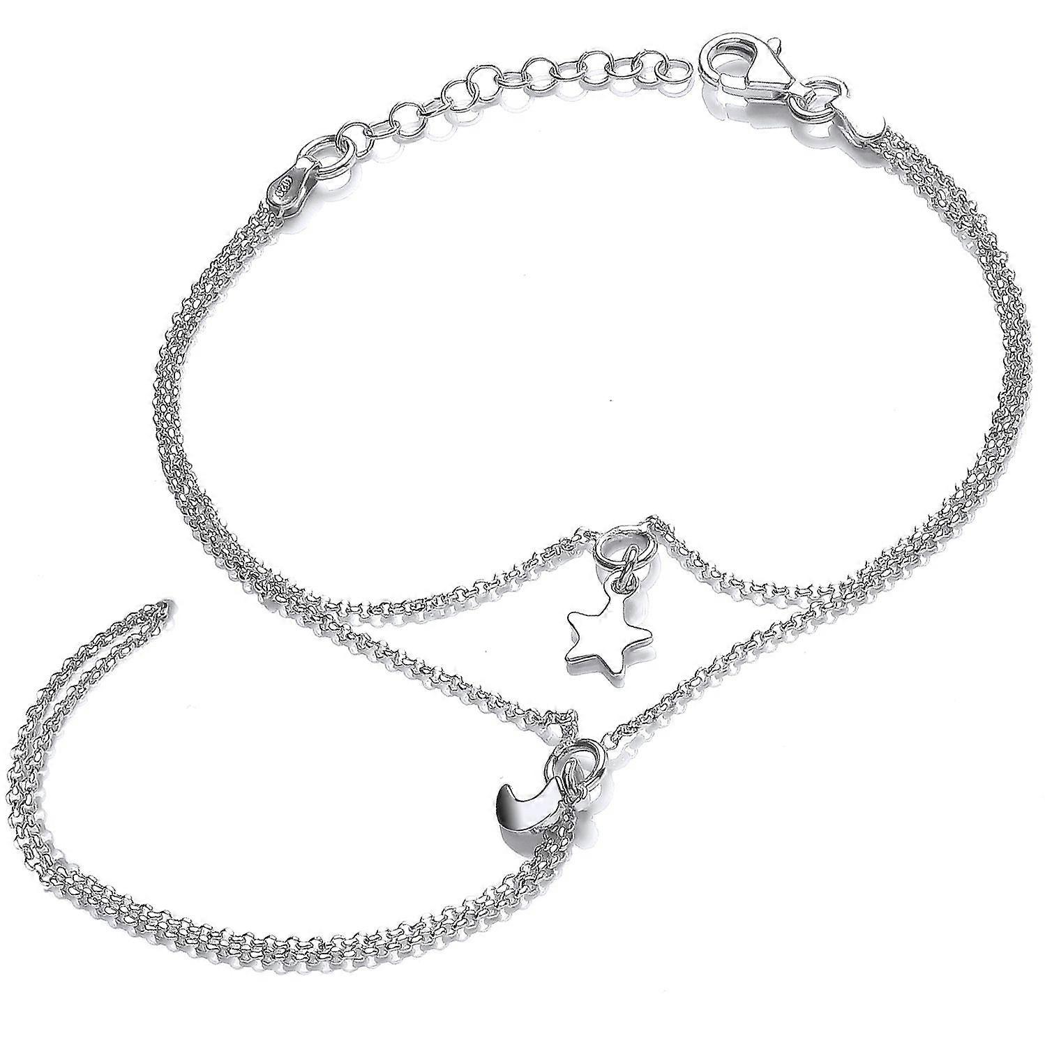 Jewelco London Ladies Rhodium Plated Sterling Silver Star Moon Charms Finger Ring Hand Chain Harem Bracelet 7 + 1 inch