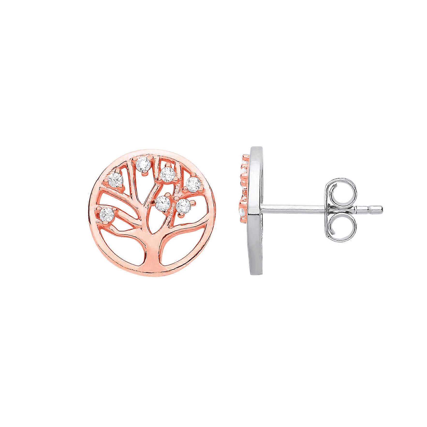 Jewelco London Ladies Rhodium & Rose Gold-Plated Sterling Silver Cubic Zirconia Tree of Life Cluster Stud Earrings