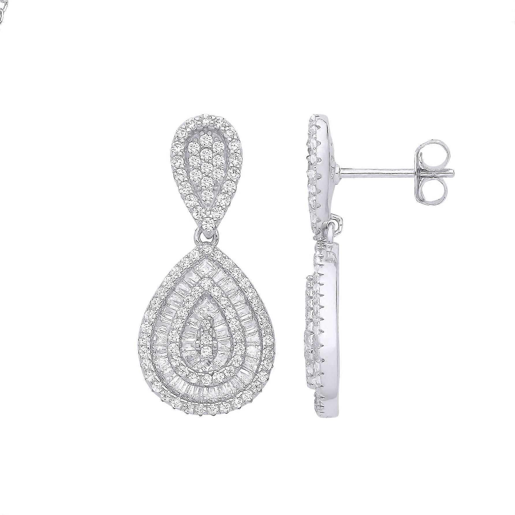 Jewelco London Ladies Rhodium Sterling Silver Baguette CZ Pear Avocado Geode Cluster Drop Earrings