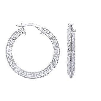Jewelco London Ladies Rhodium Sterling Silver Knife Edge Greek Eye Flat Round Hoop Creole Earrings