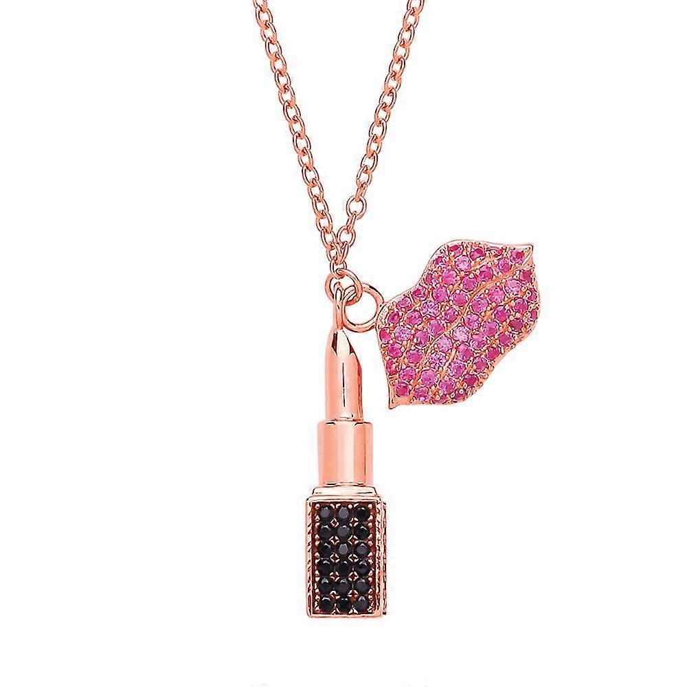 Jewelco London Ladies Rose Gold-Plated Sterling Silver Pink & Black Cubic Zirconia Lipstick Lips Kiss Charm Necklace 18 inch