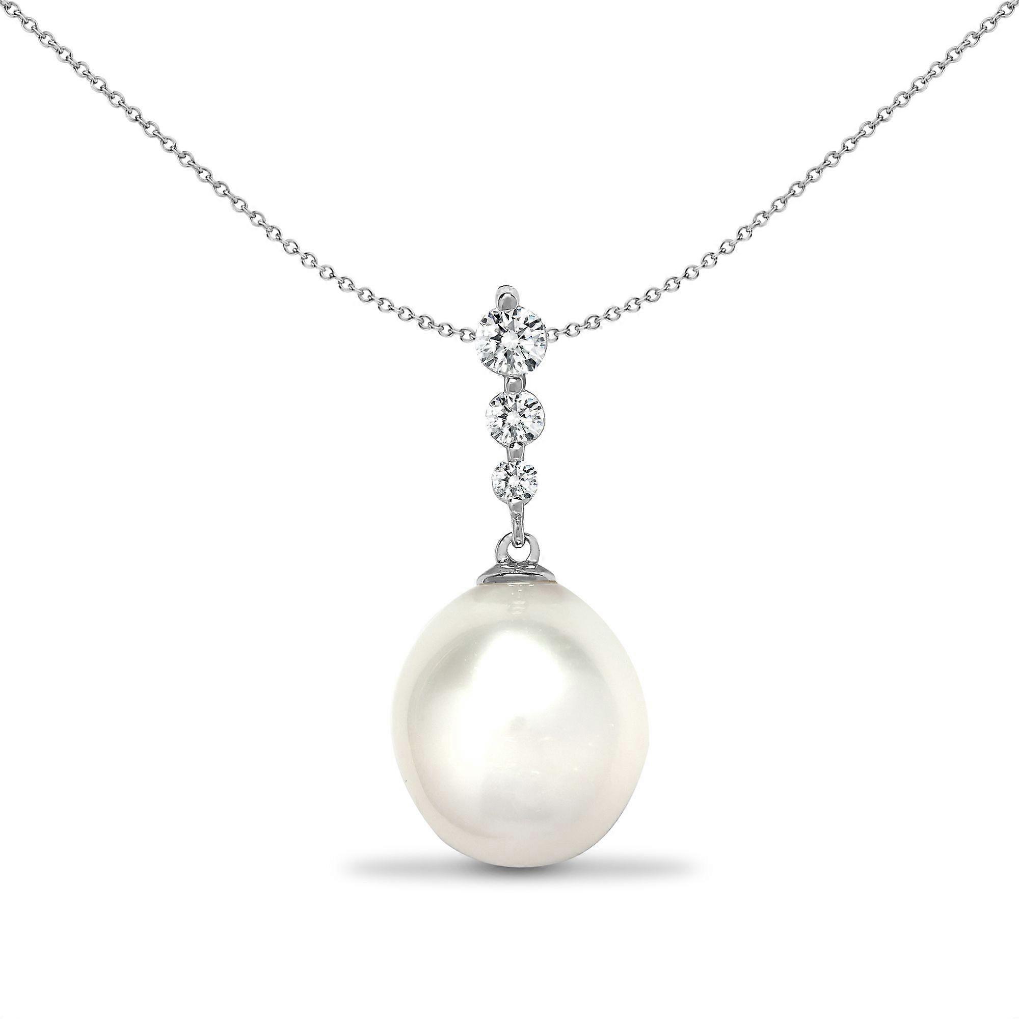 Jewelco London Ladies Solid 18ct White Gold Bar Set Round G SI1 0.2ct Diamond and Oval Pearl Trilogy Drop Pendant