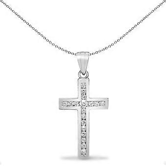 Jewelco London Ladies Solid 18ct White Gold Channel Set Round G SI1 0.18ct Diamond Flat Cross Pendant