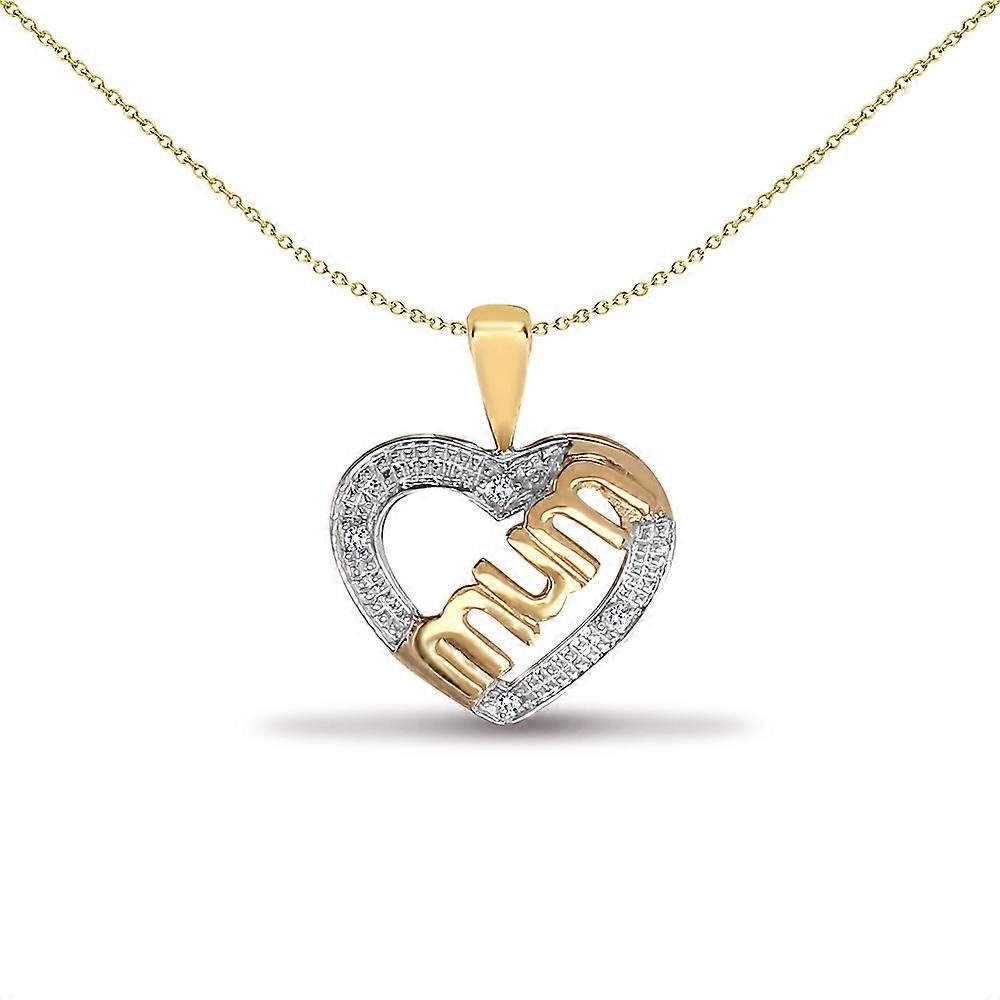 Jewelco London Ladies Solid 9ct Yellow Gold 4 Claw Set Round H I1 0.02ct Diamond Love Heart MUM Charm Pendant