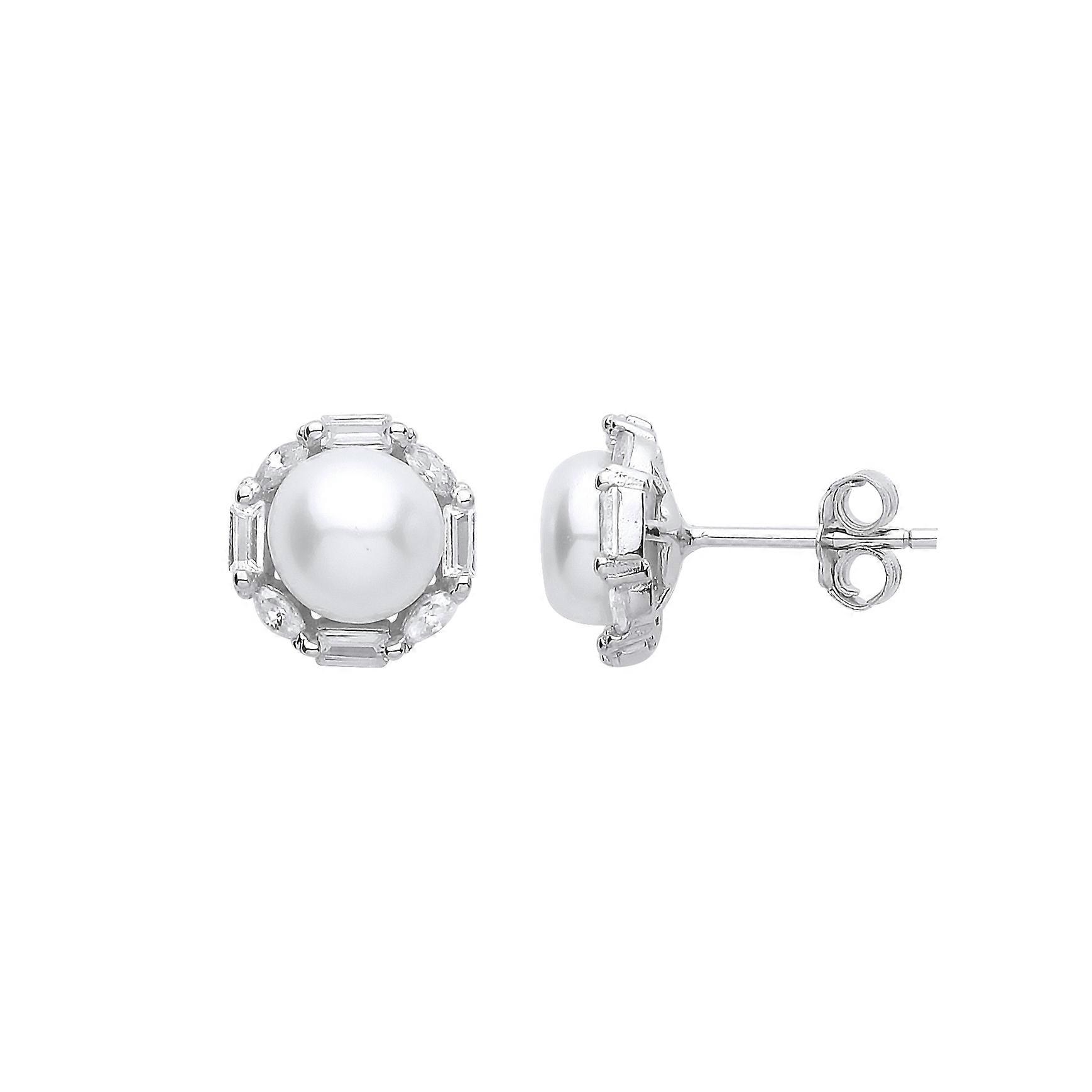 Jewelco London Ladies Sterling Silver Baguette Cubic Zirconia & Freshwater Cultured Pearl Full Moon Octagon Halo Stud Earrings 7mm