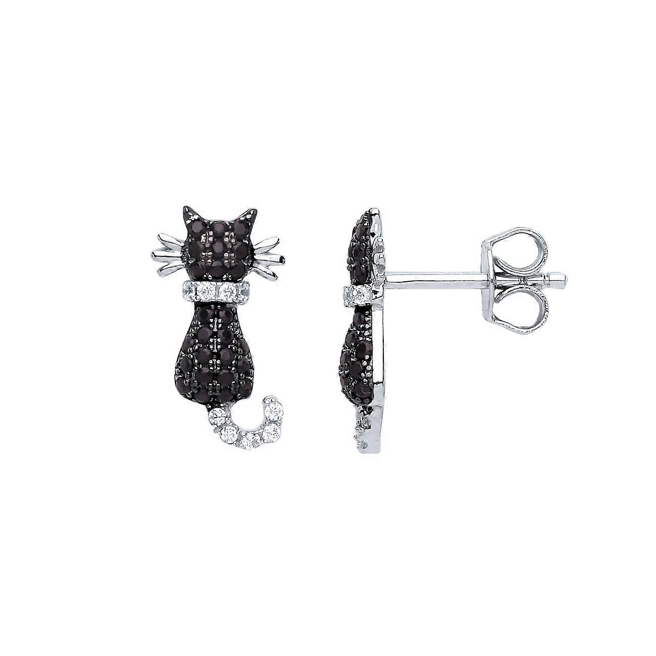 Jewelco London Ladies Sterling Silver Black Cubic Zirconia Kitty Cat Stud Earrings