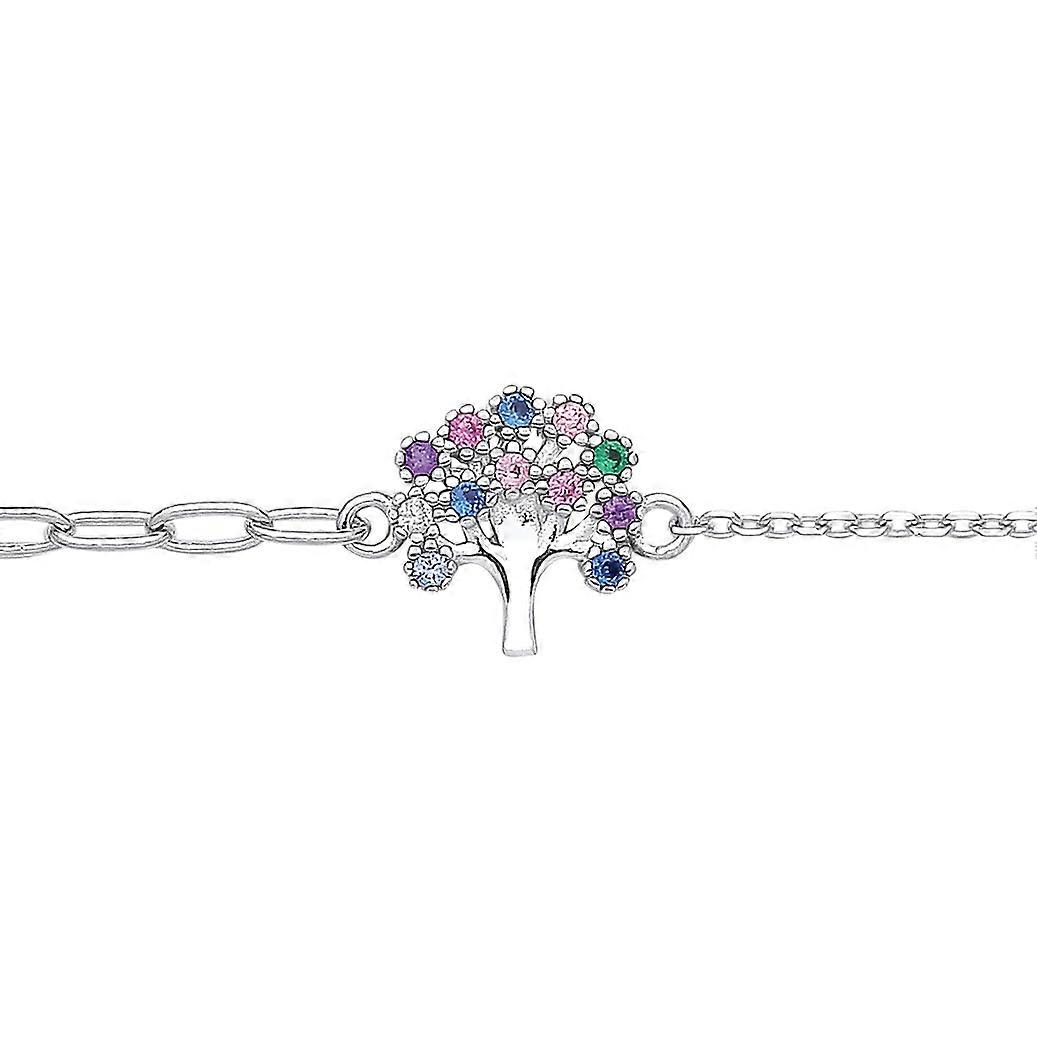 Jewelco London Ladies Sterling Silver Blue Green Purple CZ Pastel Tree of Life Rolo Charm Bracelet 2mm 7 + 1 inch