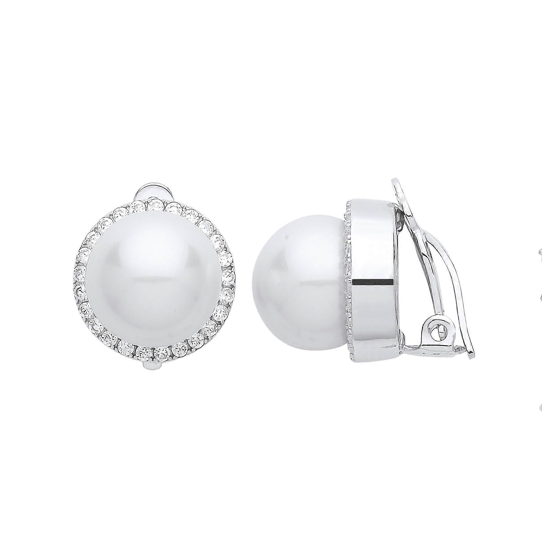 Jewelco London Ladies Sterling Silver Cubic Zirconia & Simulated Pearl Full Moon Halo Clip-on Earrings 12mm
