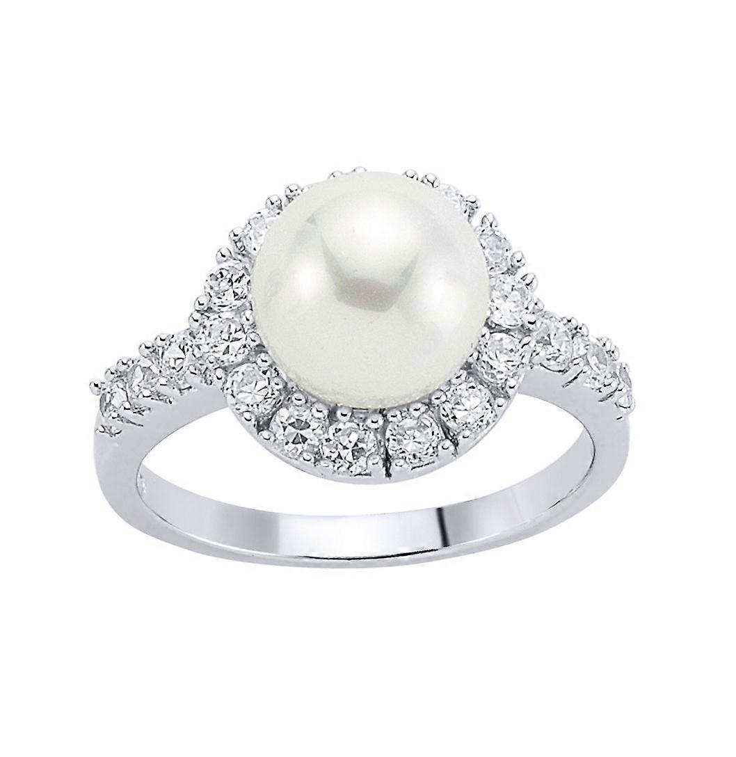 Jewelco London Ladies Sterling Silver Cubic Zirconia & Simulated Pearl Halo Full Moon Dress Ring 10mm