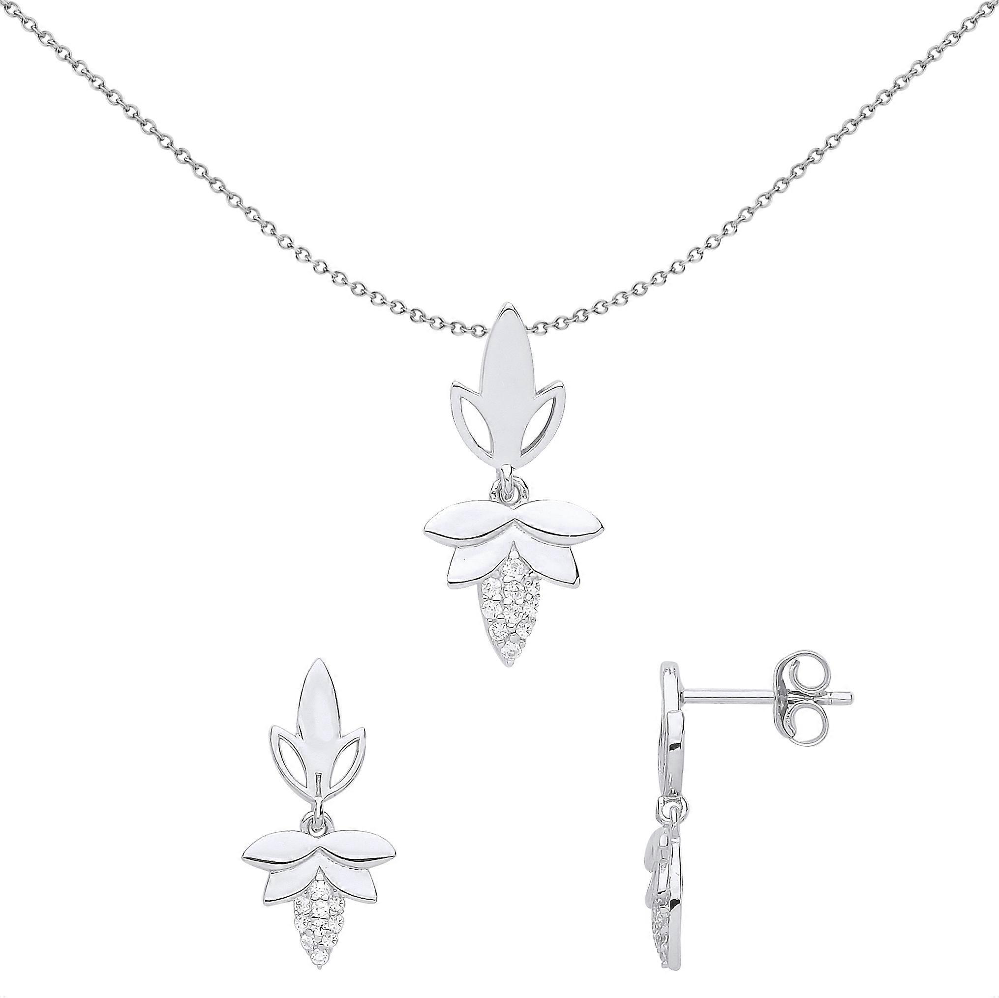 Jewelco London Ladies Sterling Silver Cubic Zirconia Sweetcorn Leaf Earrings Necklace Set