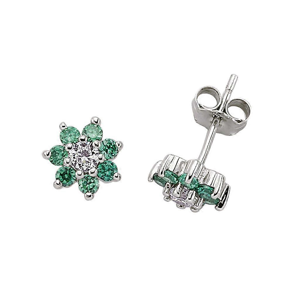 Jewelco London Ladies Sterling Silver Emerald-Green Cubic Zirconia Flower Cluster Stud Earrings