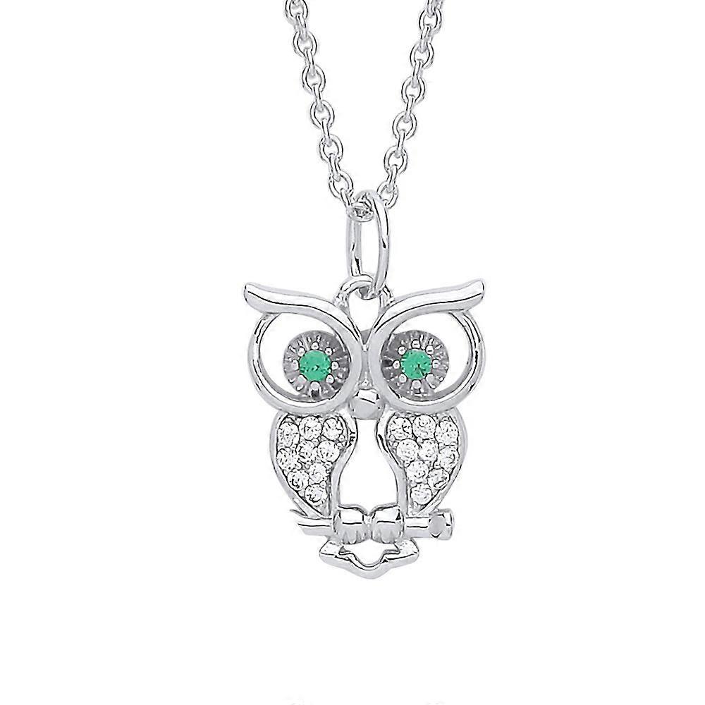 Jewelco London Ladies Sterling Silver Emerald-Green Cubic Zirconia Wise Owl Hoot Charm Necklace