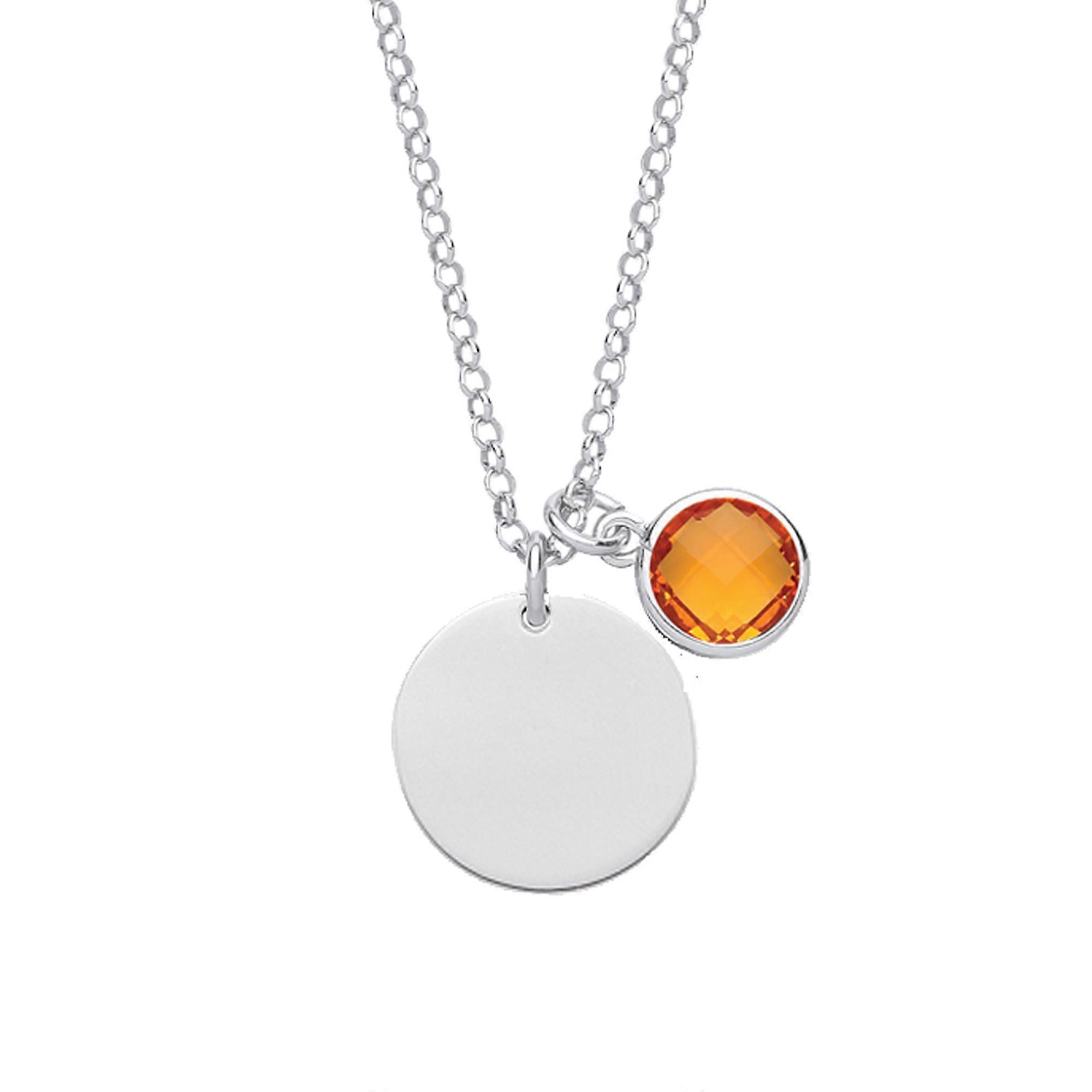 Jewelco London Ladies Sterling Silver Honey Orange Checkerboard Button Cubic Zirconia November Birthstone Medallion Necklace 16 inch