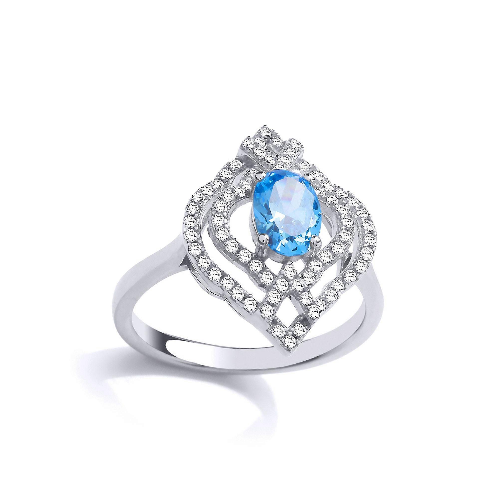Jewelco London Ladies Sterling Silver Light Blue Oval Cubic Zirconia Arabesque Clover Lantern Cluster Ring