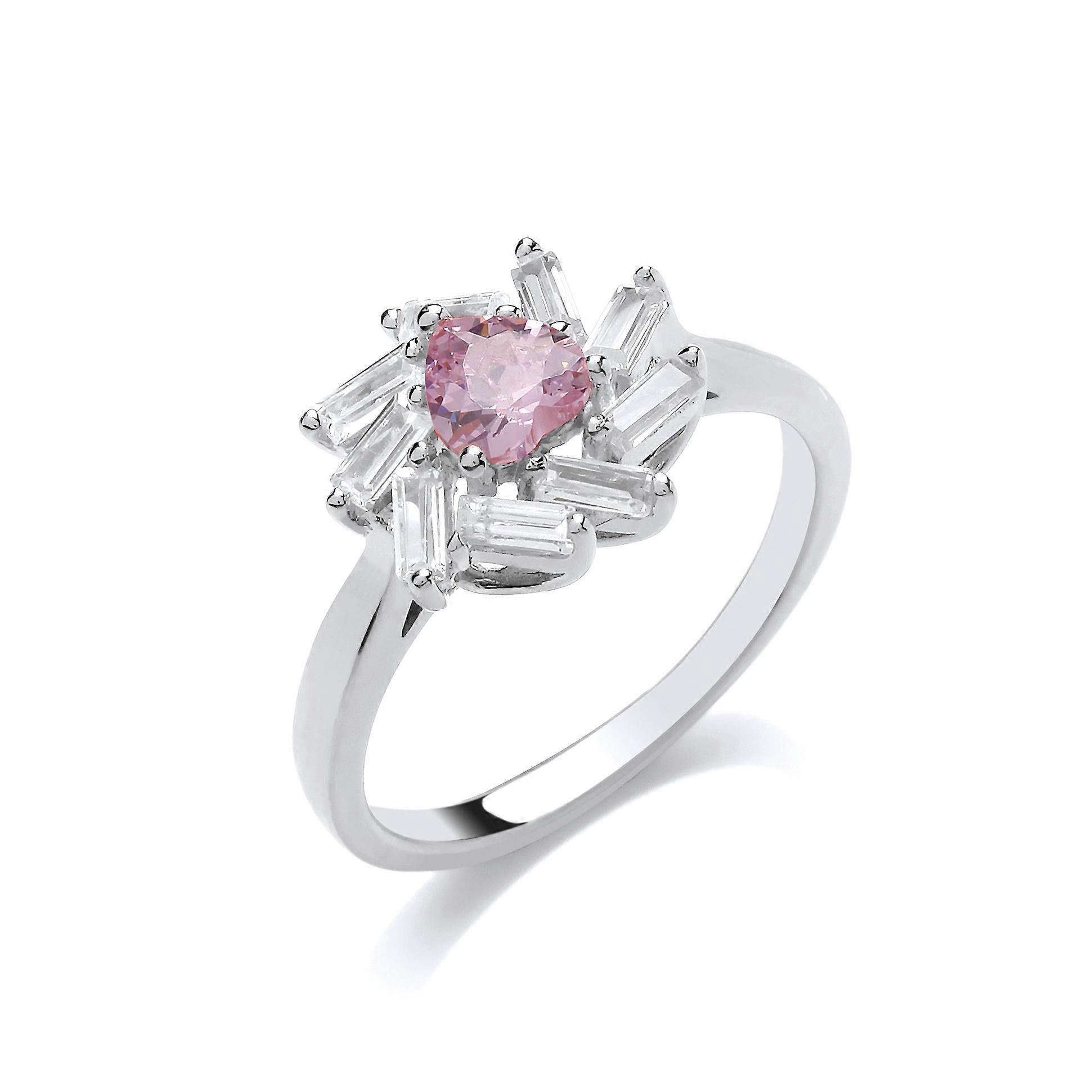 Jewelco London Ladies Sterling Silver Pink Baguette Cubic Zirconia Sunburst Love Heart Cluster Ring