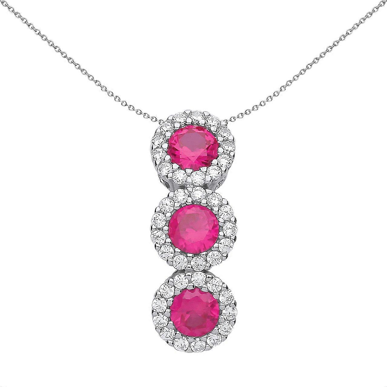 Jewelco London Ladies Sterling Silver Ruby-Red Cubic Zirconia Trilogy Halo Cluster Pendant Necklace 18 inch
