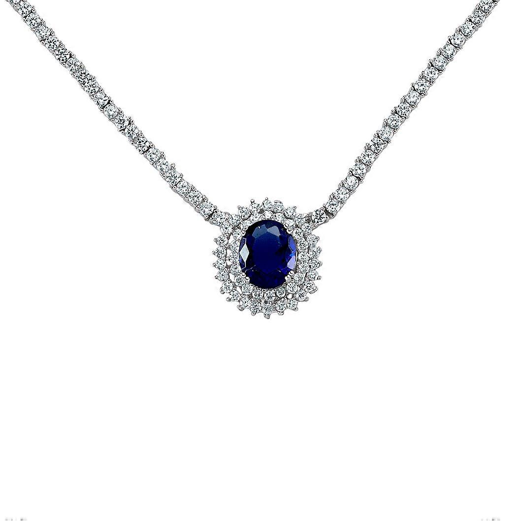 Jewelco London Ladies Sterling Silver Sapphire-Blue Oval Cubic Zirconia Royal Lady Di Cluster Pendant Necklace 15 inch