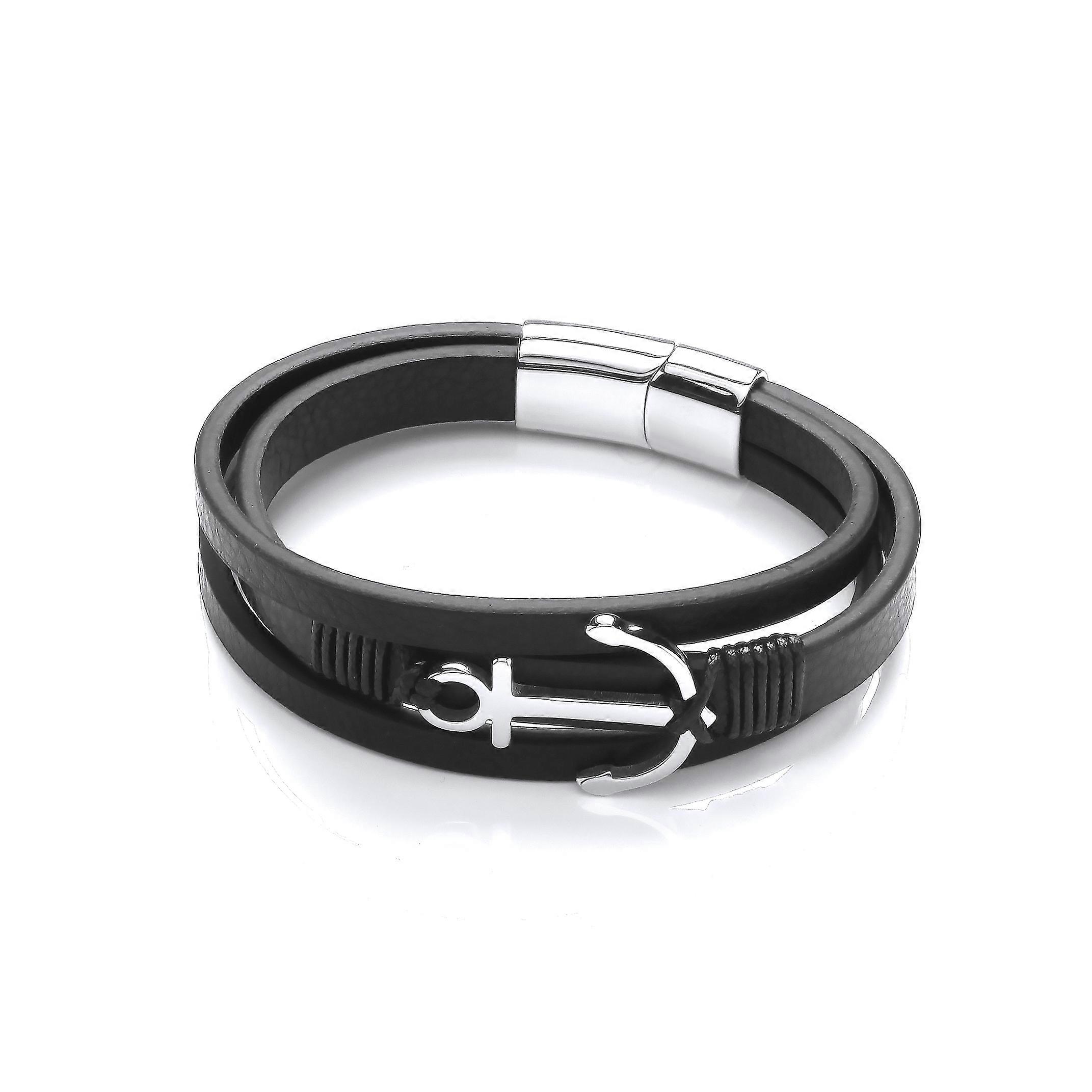 Jewelco London Mens Black Leather Stainless Steel Multi Strand Anchor Charm Strap Bracelet 8 inch