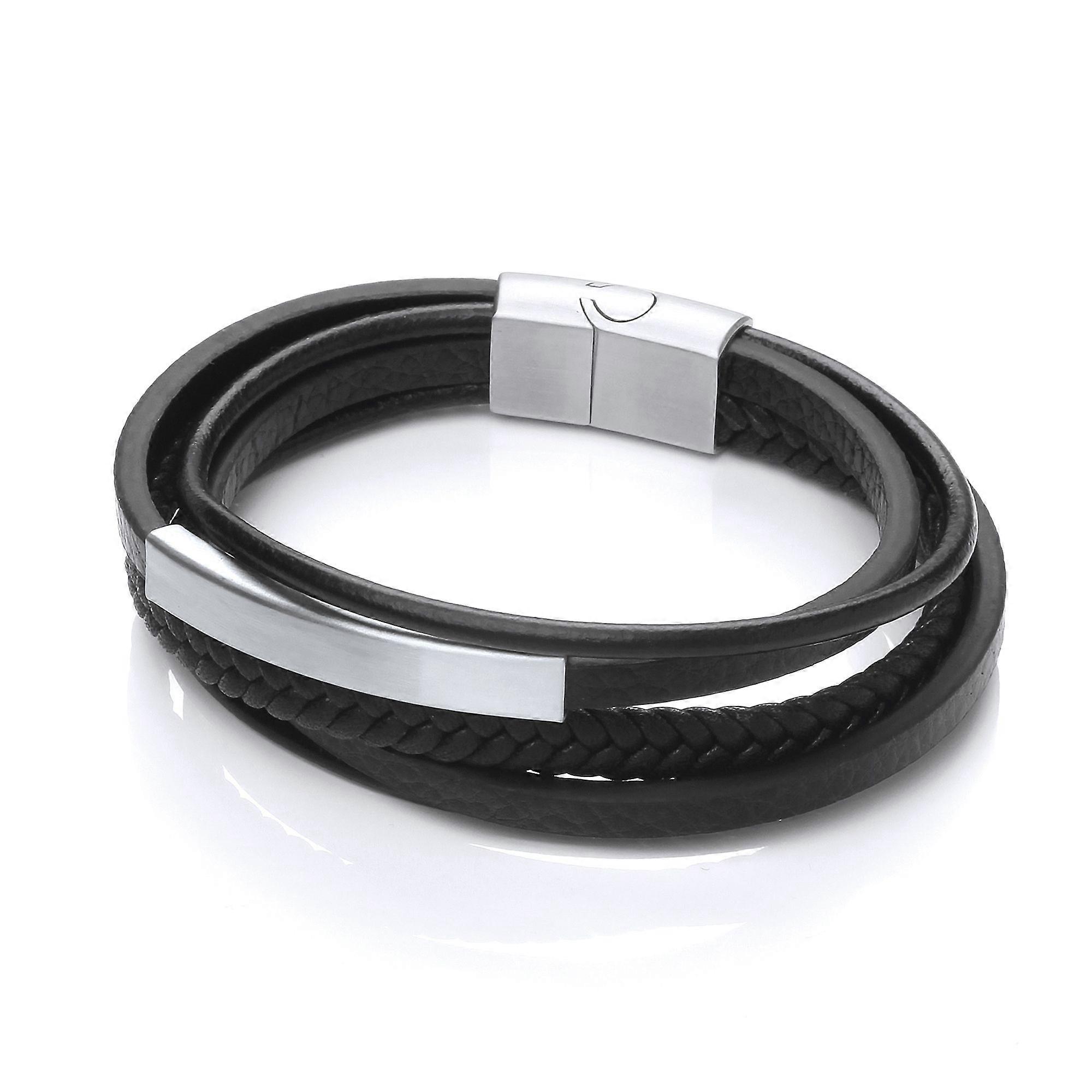 Jewelco London Mens Rhodium Plated Stainless Steel Black Leather Multi Strand ID Cuff Bracelet 18mm