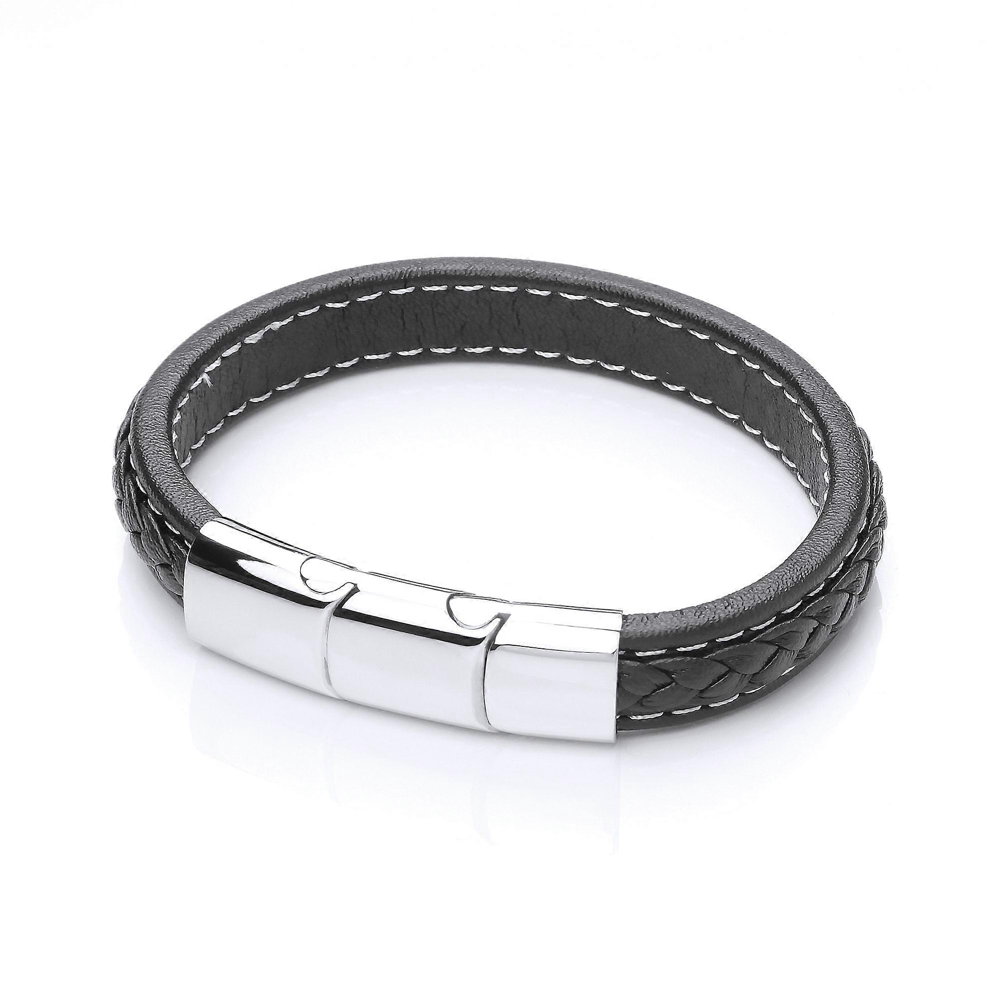 Jewelco London Mens Rhodium Plated Stainless Steel Black Leather Platted Cuff Bracelet 12mm
