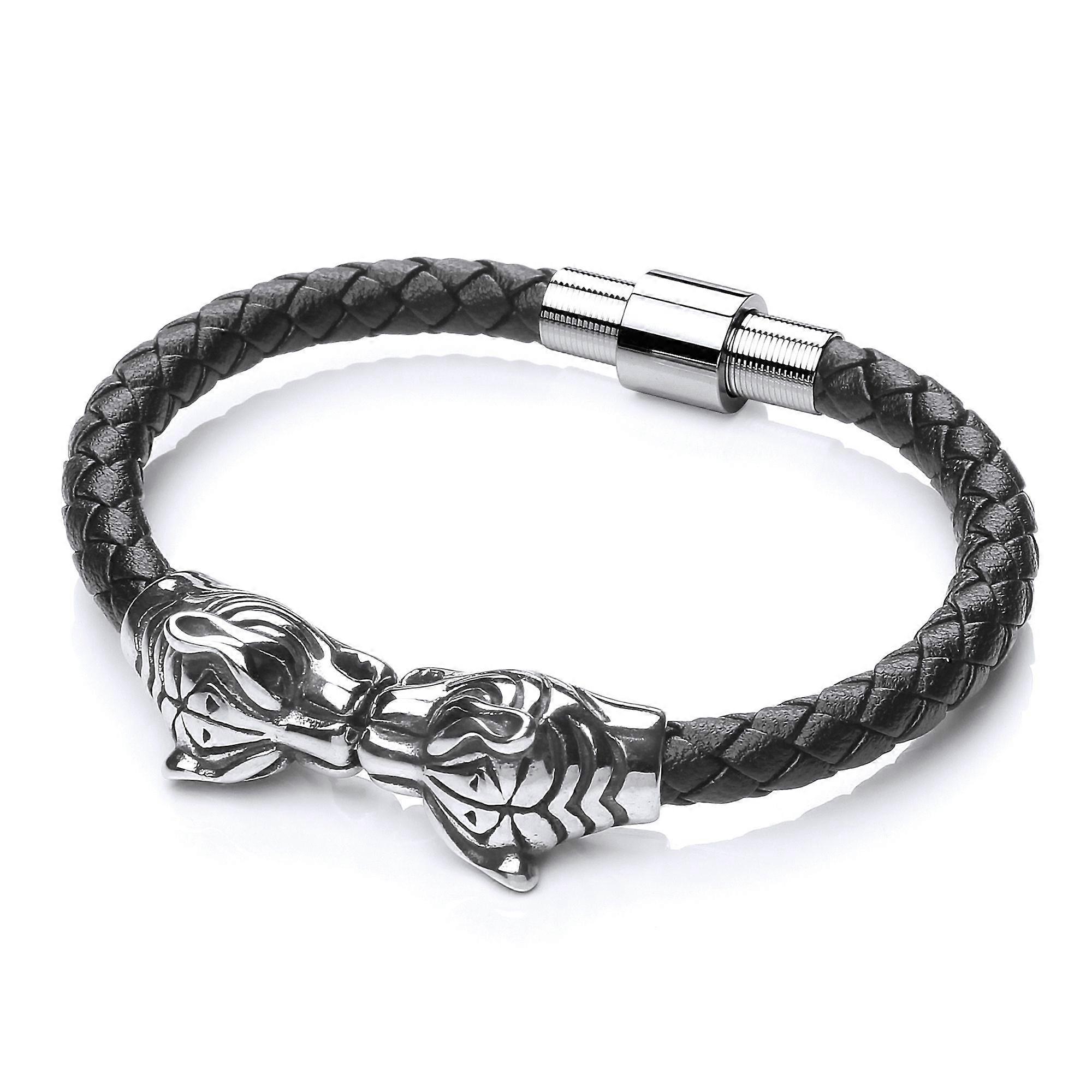 Jewelco London Mens Rhodium Plated Stainless Steel Black Leather Tiger Head Cuff Bracelet 17mm 8 inch