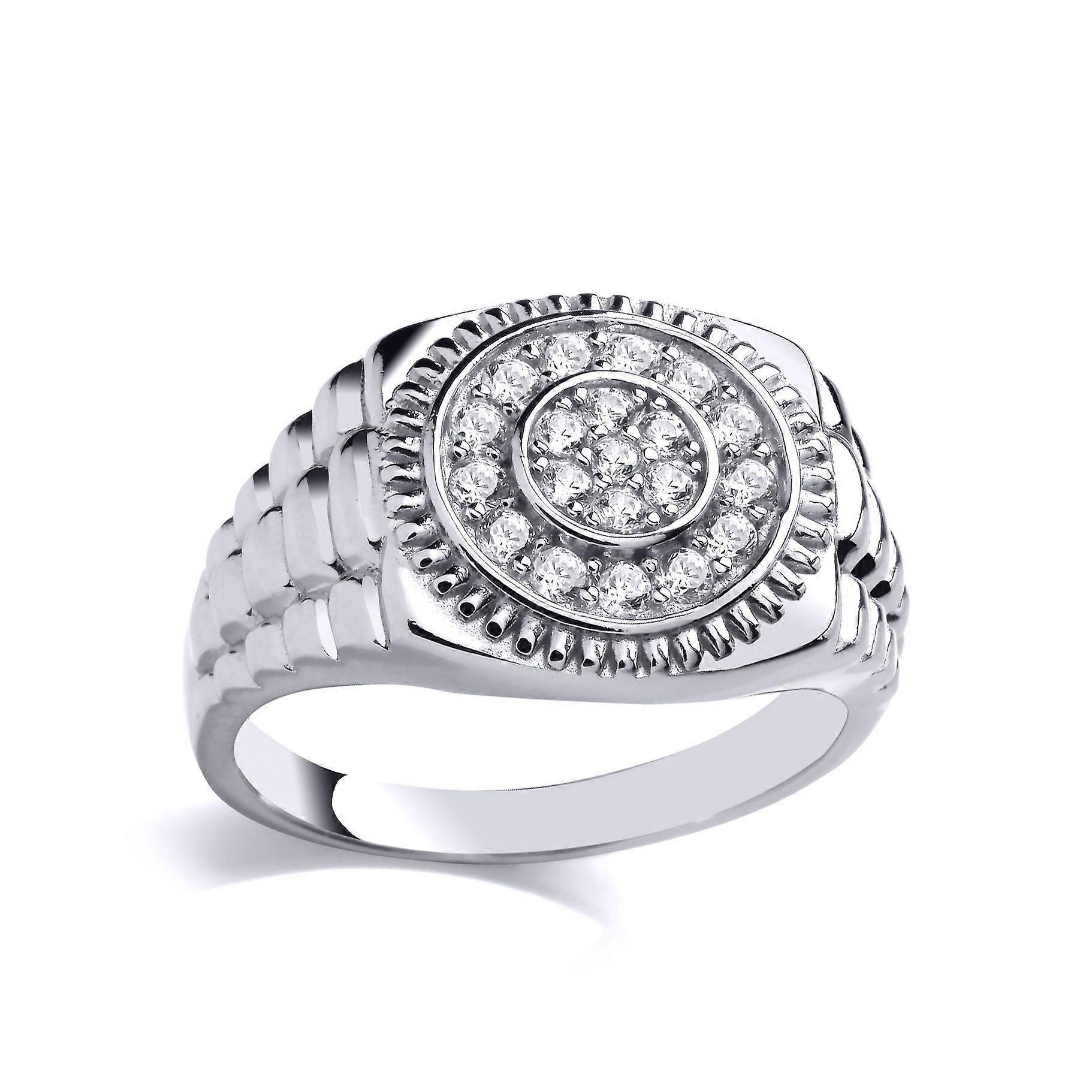 Jewelco London Mens Rhodium Plated Sterling Silver CZ Presidential Link Double Circle Halo Dial Watch Strap Signet Ring